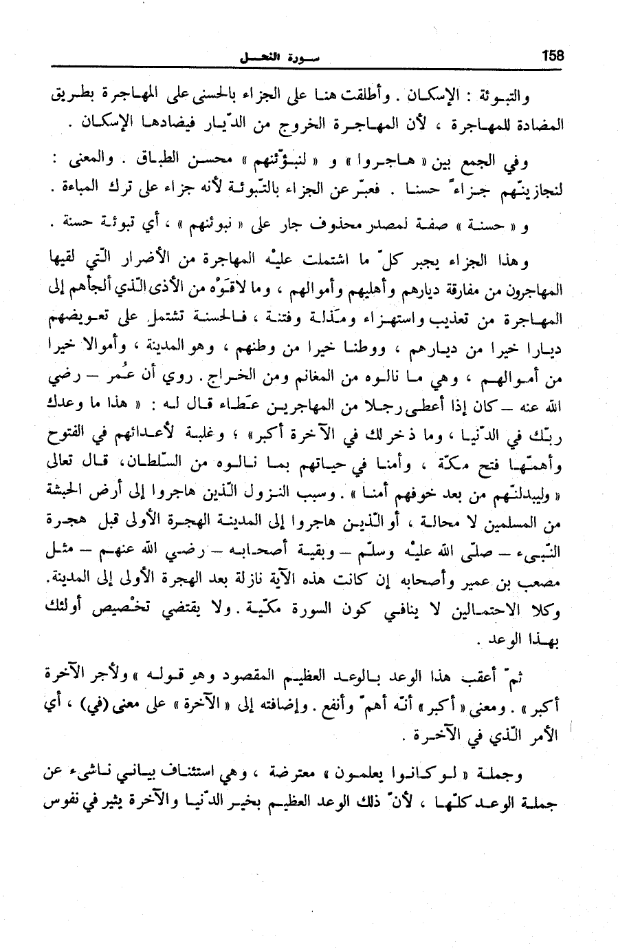 وَهَذَا الْجَزَاءُ يَجْبُرُ كُلَّ مَا اشْتَمَلَتْ عَلَيْهِ الْمُهَاجَرَةُ مِنَ الْأَضْرَارِ الَّتِي لَقِيَهَا الْمُهَاجِرُونَ مِنْ مُفَارقَة دِيَارهمْ وأهليهم وَأَمْوَالِهِمْ، وَمَا لَاقَوْهُ مِنَ الْأَذَى الَّذِي أَلْجَأَهُمْ إِلَى الْمُهَاجَرَةِ مِنْ تَعْذِيبٍ وَاسْتِهْزَاءٍ وَمَذَلَّةٍ وَفِتْنَةٍ، فَالْحَسَنَةُ تَشْتَمِلُ عَلَى تَعْوِيضِهِمْ دِيَارًا خَيْرًا مِنْ دِيَارِهِمْ، وَوَطَنًا خَيْرًا مِنْ وَطَنِهِمْ، وَهُوَ الْمَدِينَةُ، وَأَمْوَالًا خَيْرًا مِنْ أَمْوَالِهِمْ، وَهِيَ مَا نَالُوهُ مِنَ الْمَغَانِمِ وَمِنَ الْخَرَاجِ. رُوِيَ أَنَّ عُمَرَ- رَضِيَ اللَّهُ عَنْهُ- كَانَ إِذَا أَعْطَى رَجُلًا مِنَ الْمُهَاجِرِينَ عَطَاءً قَالَ لَهُ: «هَذَا مَا وَعَدَكَ رَبُّكَ فِي الدُّنْيَا، وَمَا ذَخَرَ لَكَ فِي الْآخِرَةِ أَكْبَرُ» وَغَلَبَةً لِأَعْدَائِهِمْ فِي الْفُتُوحِ وَأَهَمُّهَا فَتْحُ مَكَّةَ، وَأَمْنًا فِي حَيَاتِهِمْ بِمَا نَالُوهُ مِنَ السُّلْطَانِ، قَالَ تَعَالَى: وَلَيُبَدِّلَنَّهُمْ مِنْ بَعْدِ خَوْفِهِمْ أَمْناً [سُورَة النُّور: 55] . وَسَبَبُ النُّزُولِ الَّذِينَ هَاجَرُوا إِلَى أَرْضِ الْحَبَشَةِ مِنَ الْمُسْلِمِينَ لَا مَحَالَةَ، أَوِ الَّذِينَ هَاجَرُوا إِلَى الْمَدِينَةِ الْهِجْرَةَ الْأُولَى قَبْلَ هِجْرَةِ النَّبِيءِ صَلَّى اللهُ عَلَيْهِ وَسَلَّمَ وَبَقِيَّةُ أَصْحَابِهِ- رَضِيَ اللَّهُ عَنْهُمْ- مِثْلُ مُصْعَبِ بْنِ عُمَيْرٍ وَأَصْحَابِهِ إِنْ كَانَتْ هَذِهِ الْآيَةُ نَازِلَةً بَعْدَ الْهِجْرَةِ الْأُولَى إِلَى الْمَدِينَةِ. وَكِلَا الِاحْتِمَالَيْنِ لَا يُنَافِي كَوْنَ السُّورَةُ مَكِّيَّةً. وَلَا يَقْتَضِي تَخْصِيصَ أُولَئِكَ بِهَذَا الْوَعْدِ.