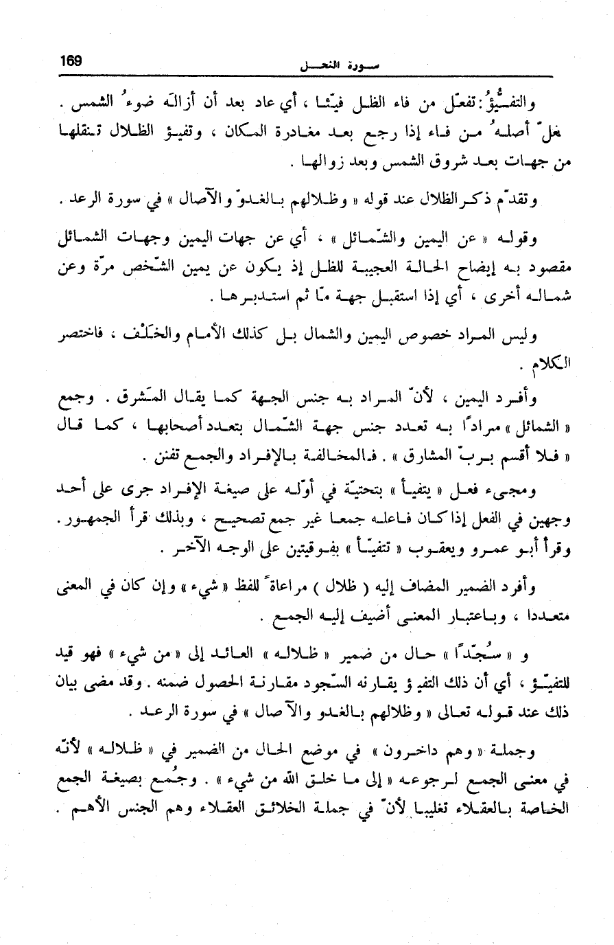 وَقَوْلُهُ: عَنِ الْيَمِينِ وَالشَّمائِلِ، أَيْ عَنْ جِهَاتِ الْيَمِينِ وَجِهَاتِ الشَّمَائِلِ مَقْصُودٌ بِهِ إِيضَاحُ الْحَالَةِ الْعَجِيبَةِ لِلظِّلِّ إِذْ يَكُونُ عَنْ يَمِينِ الشَّخْصِ مَرَّةً وَعَنْ شِمَالِهِ أُخْرَى، أَيْ إِذَا اسْتَقْبَلَ جِهَةً مَا ثُمَّ اسْتَدْبَرَهَا.