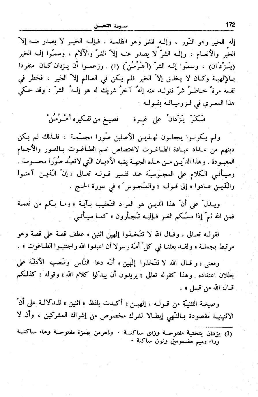 وَلَمْ يَكُونُوا يَجْعَلُونَ لِهَذَيْنِ الْأَصْلَيْنِ صُوَرًا مُجَسَّمَةً، فَلِذَلِكَ لَمْ يَكُنْ دِينُهُمْ مِنْ عِدَادِ عِبَادَةِ الطَّاغُوتِ لِاخْتِصَاصِ اسْمِ الطَّاغُوتِ بِالصُّوَرِ وَالْأَجْسَامِ الْمَعْبُودَةِ. وَهَذَا الدِّينُ مِنْ هَذِهِ الْجِهَةِ يُشْبِهُ الْأَدْيَانَ الَّتِي لَا تَعْبُدُ صُوَرًا مَحْسُوسَةً. وَسَيَأْتِي الْكَلَامُ عَلَى الْمَجُوسِيَّةِ عِنْدَ تَفْسِيرِ قَوْلِهِ تَعَالَى: إِنَّ الَّذِينَ آمَنُوا وَالَّذِينَ هادُوا إِلَى قَوْلِهِ وَالْمَجُوسَ فِي سُورَةِ الْحَجِّ [17] .