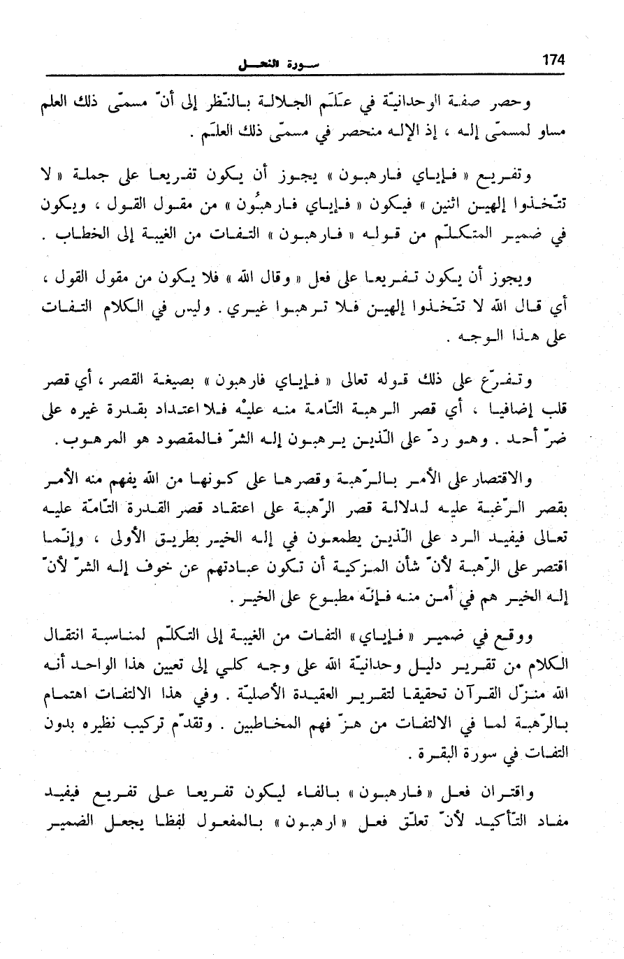 وَتَفَرَّعَ عَلَى ذَلِكَ قَوْلُهُ تَعَالَى: فَإِيَّايَ فَارْهَبُونِ بِصِيغَةِ الْقَصْرِ، أَيْ قَصْرَ قَلْبٍ إِضَافِيًّا، أَيْ قَصَرَ الرَّهْبَةَ التَّامَّةَ مِنْهُ عَلَيْهِ فَلَا اعْتِدَادَ بِقُدْرَةِ غَيْرِهِ عَلَى ضُرِّ أَحَدٍ. وَهُوَ رَدٌّ عَلَى الَّذِينَ يَرْهَبُونَ إِلَهَ الشَّرِّ فَالْمَقْصُودُ هُوَ الْمَرْهُوبُ.
