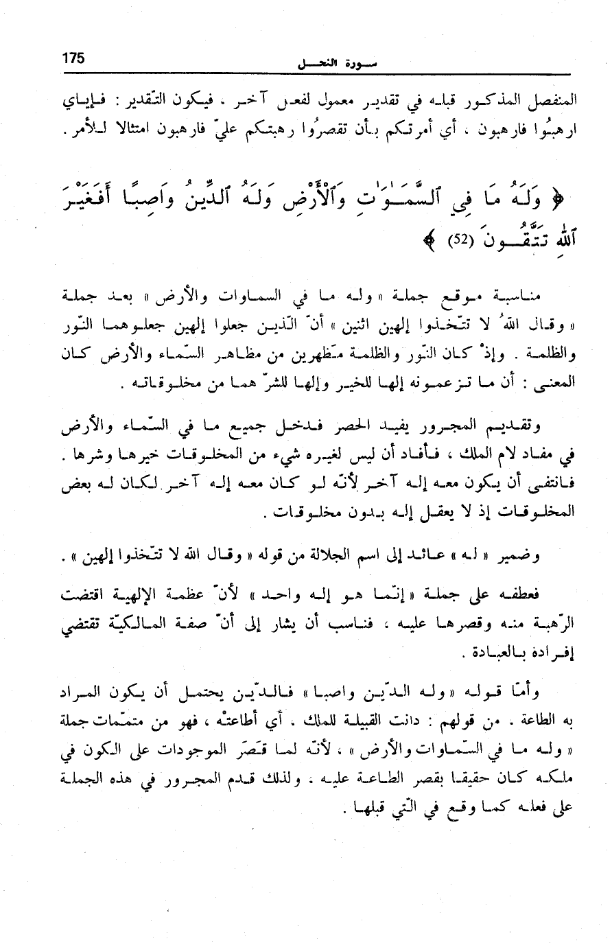 مُنَاسَبَةُ مَوْقِعِ جُمْلَةِ وَلَهُ مَا فِي السَّماواتِ وَالْأَرْضِ بَعْدَ جُمْلَةِ وَقالَ اللَّهُ لَا تَتَّخِذُوا إِلهَيْنِ اثْنَيْنِ [سُورَة النَّحْل: 51] أَنَّ الَّذِينَ جَعَلُوا إِلَهَيْنِ جَعَلُوهُمَا النُّورَ وَالظُّلْمَةَ. وَإِذْ كَانَ النُّورُ وَالظُّلْمَةُ مَظْهَرَيْنِ مِنْ مَظَاهِرِ السَّمَاءِ وَالْأَرْضِ كَانَ الْمَعْنَى: أَنَّ مَا تَزْعُمُونَهُ إِلَهًا لِلْخَيْرِ وَإِلَهَا لِلشَّرِّ هُمَا مِنْ مَخْلُوقَاتِهِ.