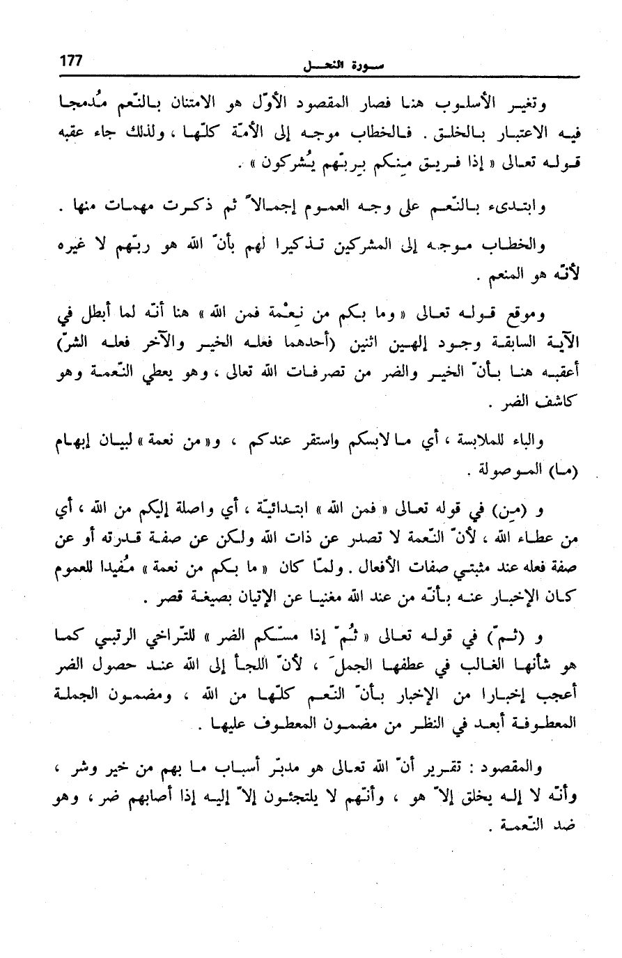 وَتَغَيَّرَ الْأُسْلُوبُ هُنَا فَصَارَ الْمَقْصُودُ الْأَوَّلُ هُوَ الِامْتِنَانُ بِالنِّعَمِ مُدْمَجًا فِيهِ الِاعْتِبَارُ بِالْخَلْقِ. فَالْخِطَابُ مُوَجَّهٌ إِلَى الْأُمَّةِ كُلِّهَا، وَلِذَلِكَ جَاءَ عَقِبَهُ قَوْلُهُ تَعَالَى: إِذا فَرِيقٌ مِنْكُمْ بِرَبِّهِمْ يُشْرِكُونَ.