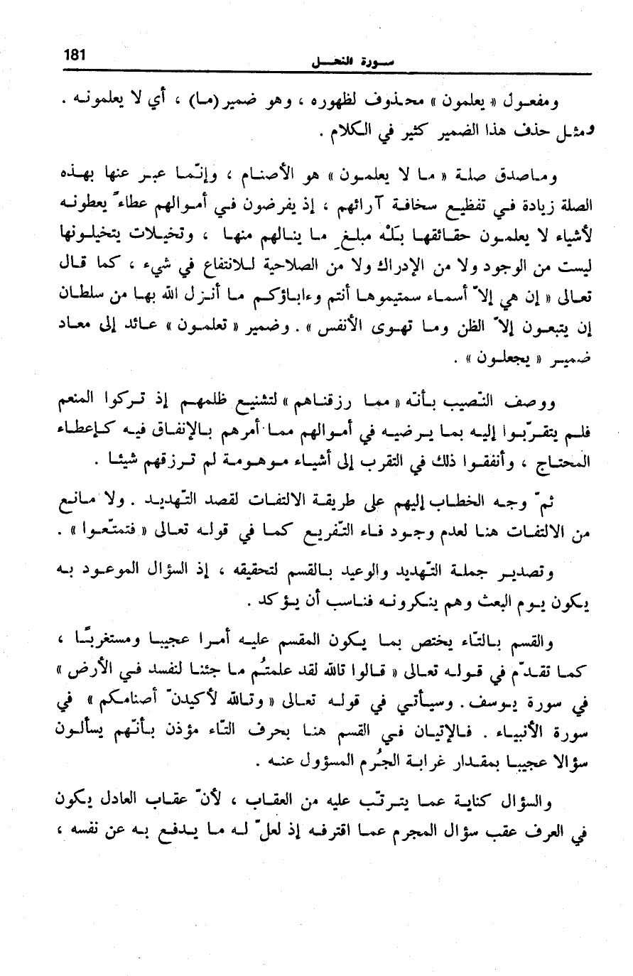 وَمَا صدق صلَة لِما لَا يَعْلَمُونَ هُوَ الْأَصْنَامُ، وَإِنَّمَا عُبِّرَ عَنْهَا بِهَذِهِ الصِّلَةِ زِيَادَةً فِي تَفْظِيعِ سَخَافَةِ آرَائِهِمْ، إِذْ يَفْرِضُونَ فِي أَمْوَالِهِمْ عَطَاءً يُعْطُونَهُ لِأَشْيَاءَ لَا يَعْلَمُونَ حَقَائِقَهَا بَلْهَ مَبْلَغِ مَا يَنَالُهُمْ مِنْهَا، وَتَخَيُّلَاتٍ يَتَخَيَّلُونَهَا لَيست من الْوُجُودِ وَلَا من الْإِدْرَاكِ وَلَا مِنَ الصَّلَاحِيَةِ لِلِانْتِفَاعِ فِي شَيْءٍ، كَمَا قَالَ تَعَالَى: إِنْ هِيَ إِلَّا أَسْماءٌ سَمَّيْتُمُوها أَنْتُمْ وَآباؤُكُمْ