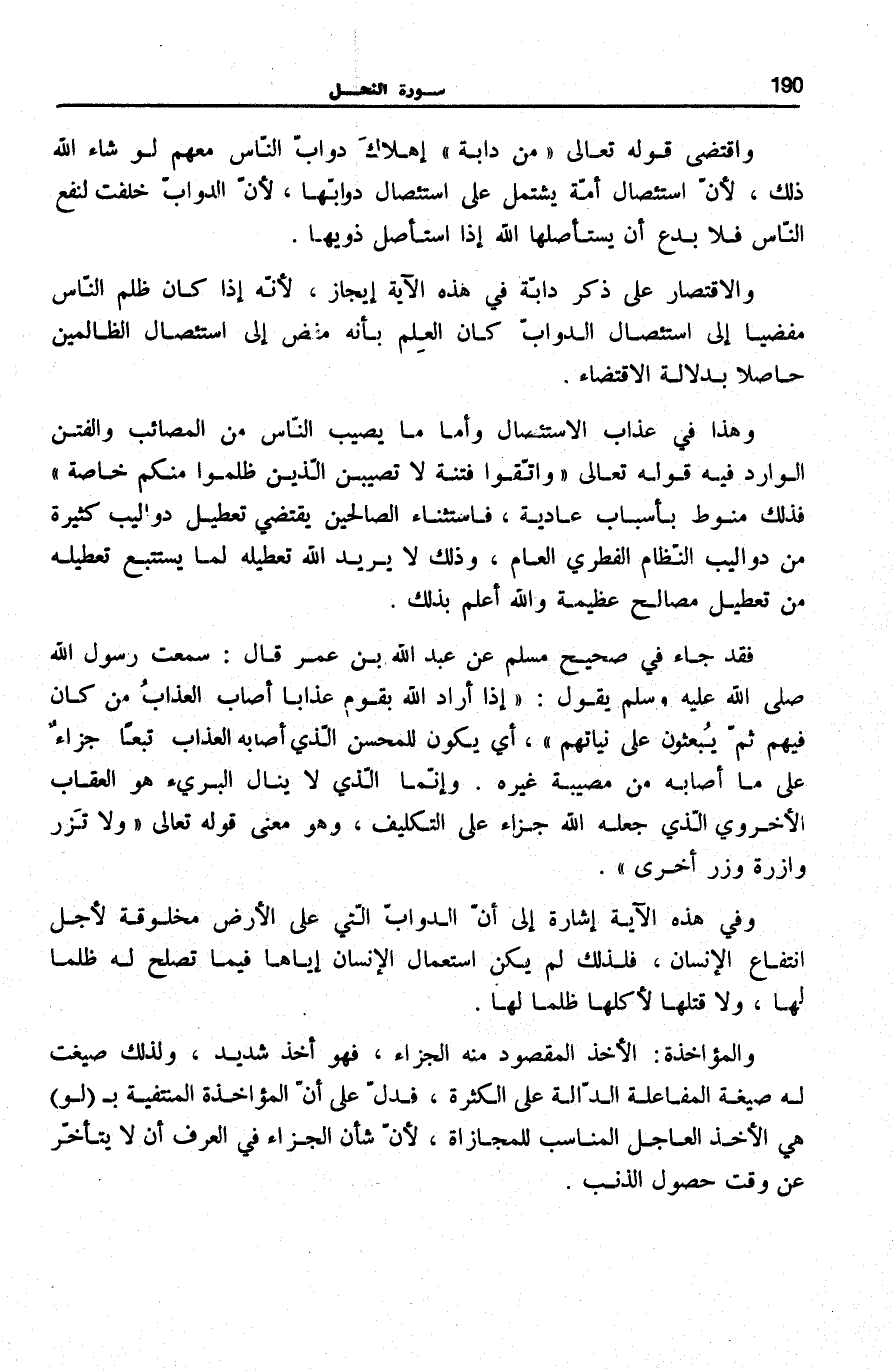 وَالِاقْتِصَارُ عَلَى ذِكْرِ دَابَّةٍ فِي هَذِهِ الْآيَةِ إِيجَازٌ، لِأَنَّهُ إِذَا كَانَ ظُلْمُ النَّاسِ مُفْضِيًا إِلَى اسْتِئْصَالِ الدَّوَابِّ كَانَ الْعِلْمُ بِأَنَّهُ مُفْضٍ إِلَى اسْتِئْصَالِ الظَّالِمِينَ حَاصِلًا بِدَلَالَةِ الِاقْتِضَاءِ.