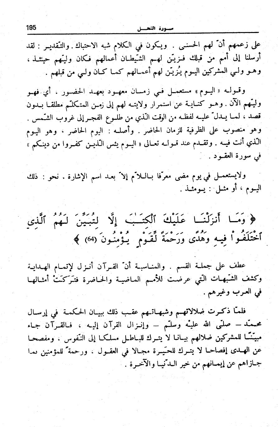وَما أَنْزَلْنا عَلَيْكَ الْكِتابَ إِلاَّ لِتُبَيِّنَ لَهُمُ الَّذِي اخْتَلَفُوا فِيهِ وَهُدىً وَرَحْمَةً لِقَوْمٍ يُؤْمِنُونَ (64)