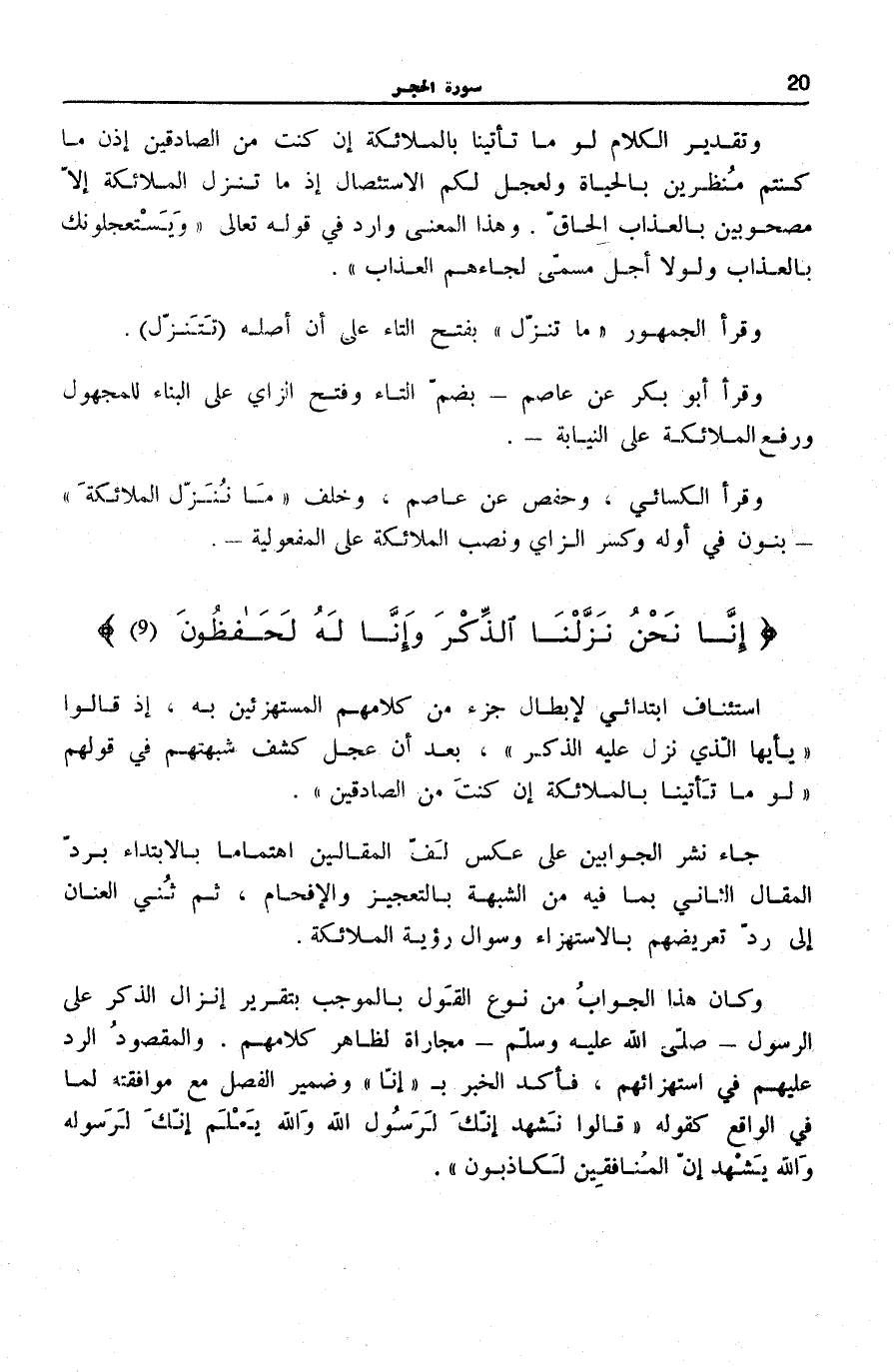 وَكَانَ هَذَا الْجَوَابُ مِنْ نَوْعِ الْقَوْلِ بِالْمُوجِبِ بِتَقْرِيرِ إِنْزَالِ الذِّكْرِ عَلَى الرَّسُولِ صَلَّى اللهُ عَلَيْهِ وَسَلَّمَ مُجَارَاةً لِظَاهِرِ كَلَامِهِمْ. وَالْمَقْصُودُ الرَّدُّ عَلَيْهِمْ فِي اسْتِهْزَائِهِمْ، فَأُكِّدَ الْخَبَرُ بِ إِنَّا وَضَمِيرِ الْفَصْلِ مَعَ مُوَافَقَتِهِ لِمَا فِي الْوَاقِعِ كَقَوْلِهِ: قالُوا نَشْهَدُ إِنَّكَ لَرَسُولُ اللَّهِ وَاللَّهُ يَعْلَمُ إِنَّكَ لَرَسُولُهُ وَاللَّهُ يَشْهَدُ إِنَّ الْمُنافِقِينَ لَكاذِبُونَ [سُورَة المُنَافِقُونَ: 1] .