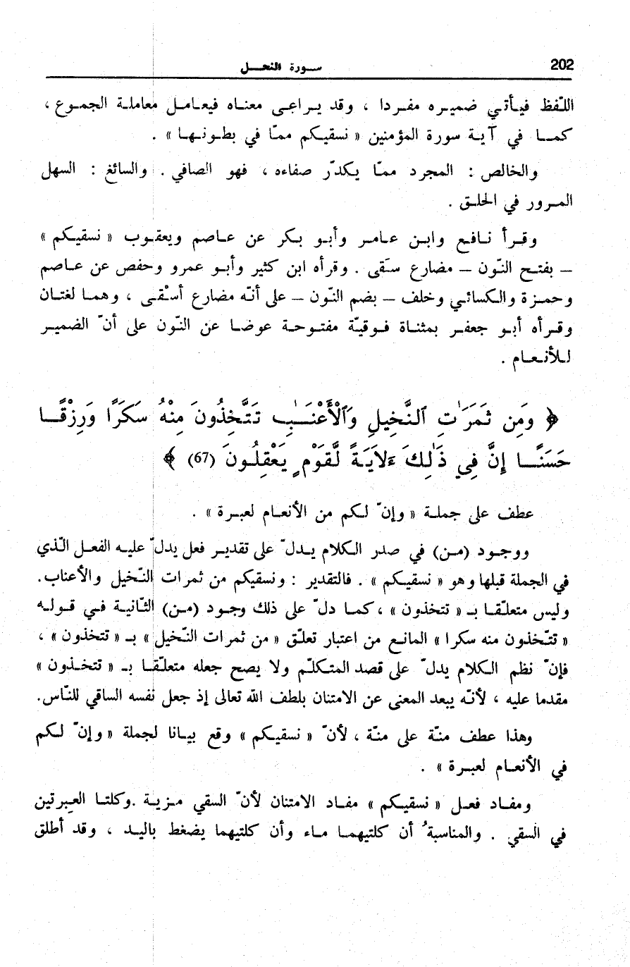 تَتَّخِذُونَ مِنْهُ سَكَراً الْمَانِعُ مِنَ اعْتِبَارِ تَعَلُّقِ مِنْ ثَمَراتِ النَّخِيلِ بِ تَتَّخِذُونَ، فَإِنَّ نُظُمَ الْكَلَامِ يَدُلُّ عَلَى قَصْدِ الْمُتَكَلِّمِ وَلَا يَصِحُّ جَعْلُهُ مُتَعَلِّقًا بِ تَتَّخِذُونَ مُقَدَّمًا عَلَيْهِ، لِأَنَّهُ يَبْعُدُ الْمَعْنَى عَنْ الِامْتِنَانِ بِلُطْفِ اللَّهِ تَعَالَى إِذْ جَعَلَ نَفْسَهُ السَّاقِي لِلنَّاسِ.