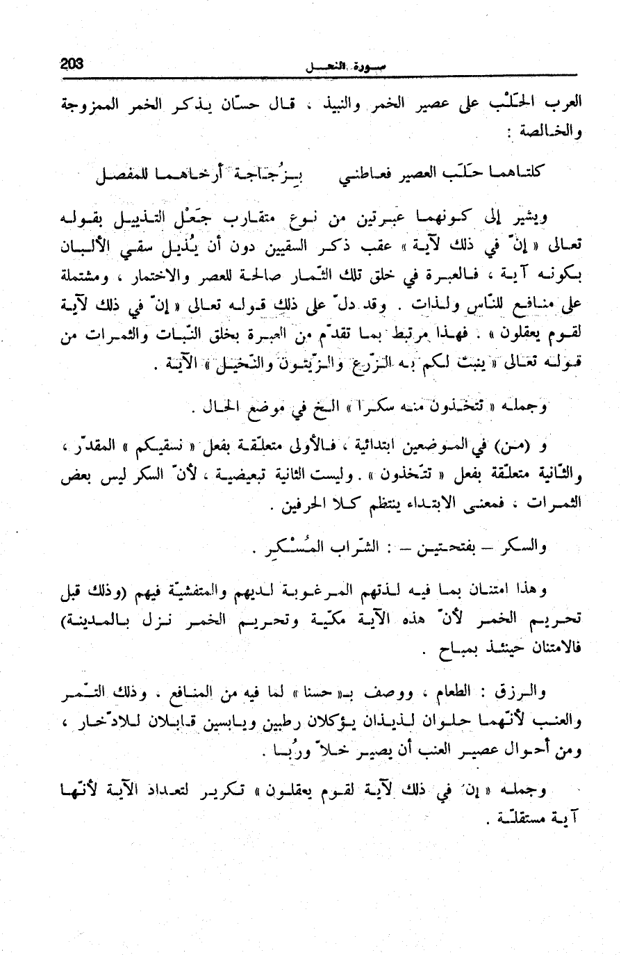 وَهَذَا امْتِنَانٌ بِمَا فِيهِ لَذَّتُهُمُ الْمَرْغُوبَةُ لَدَيْهِمْ وَالْمُتَفَشِّيَةُ فِيهِمْ (وَذَلِكَ قَبْلَ تَحْرِيمِ الْخَمْرِ لِأَنَّ هَذِهِ الْآيَةَ مَكِّيَّةٌ وَتَحْرِيمُ الْخَمْرِ نَزَلَ بِالْمَدِينَةِ) فَالِامْتِنَانُ حِينَئِذٍ بِمُبَاحٍ.