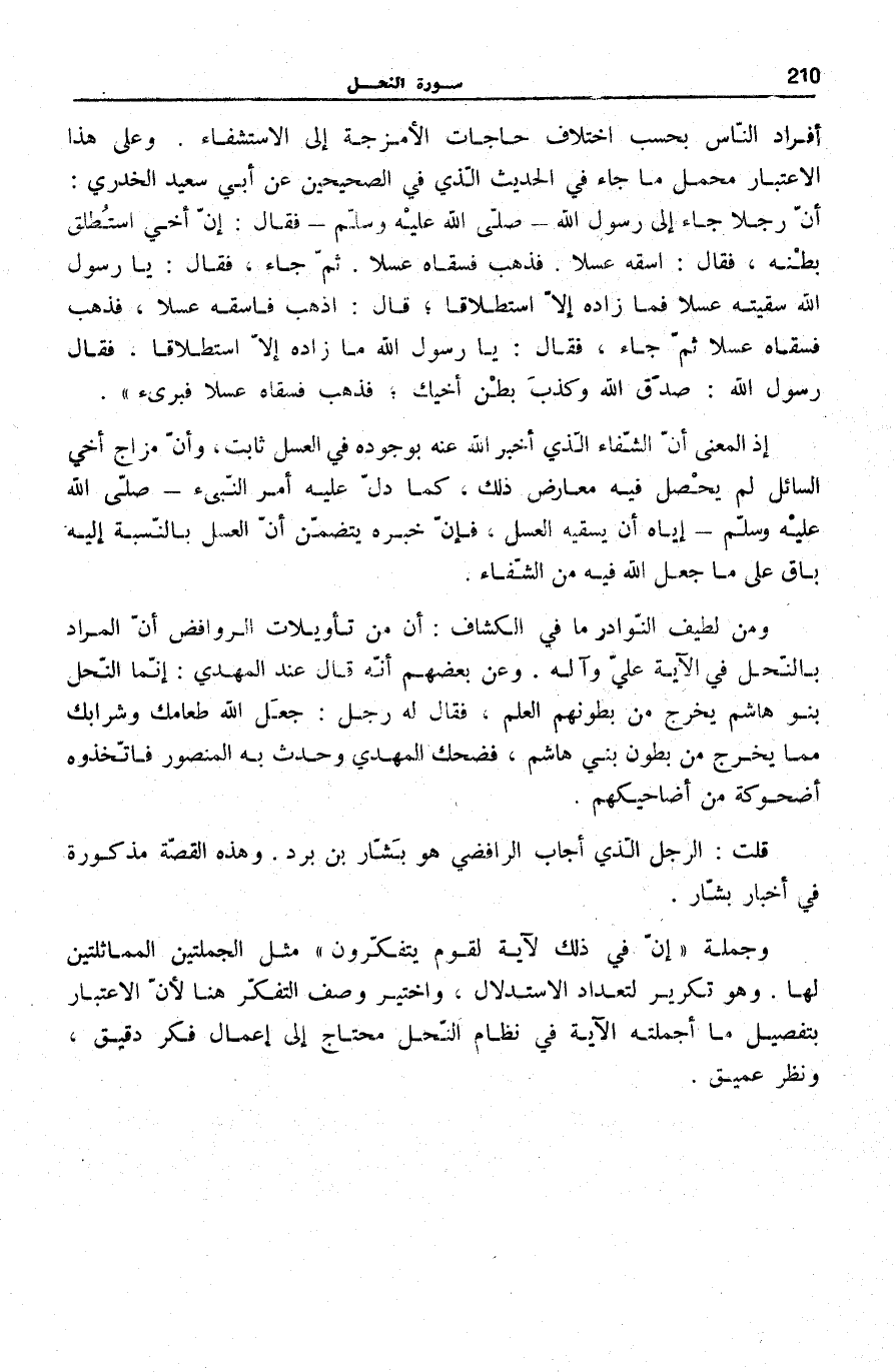 . إِذِ الْمَعْنَى أَنَّ الشِّفَاءَ الَّذِي أَخْبَرَ اللَّهُ عَنْهُ بِوُجُودِهِ فِي الْعَسَلِ ثَابِتٌ، وَأَنَّ مِزَاجَ أَخِي السَّائِلِ لَمْ يَحْصُلْ فِيهِ مُعَارِضُ ذَلِكَ، كَمَا دَلَّ عَلَيْهِ أَمْرُ النَّبِيءِ صَلَّى اللهُ عَلَيْهِ وَسَلَّمَ إِيَّاهُ أَنْ يَسْقِيَهُ الْعَسَلَ، فَإِنَّ خَبَرَهُ يَتَضَمَّنُ أَنَّ الْعَسَلَ بِالنِّسْبَةِ إِلَيْهِ بَاقٍ عَلَى مَا جَعَلَ اللَّهُ فِيهِ مِنَ الشِّفَاءِ.