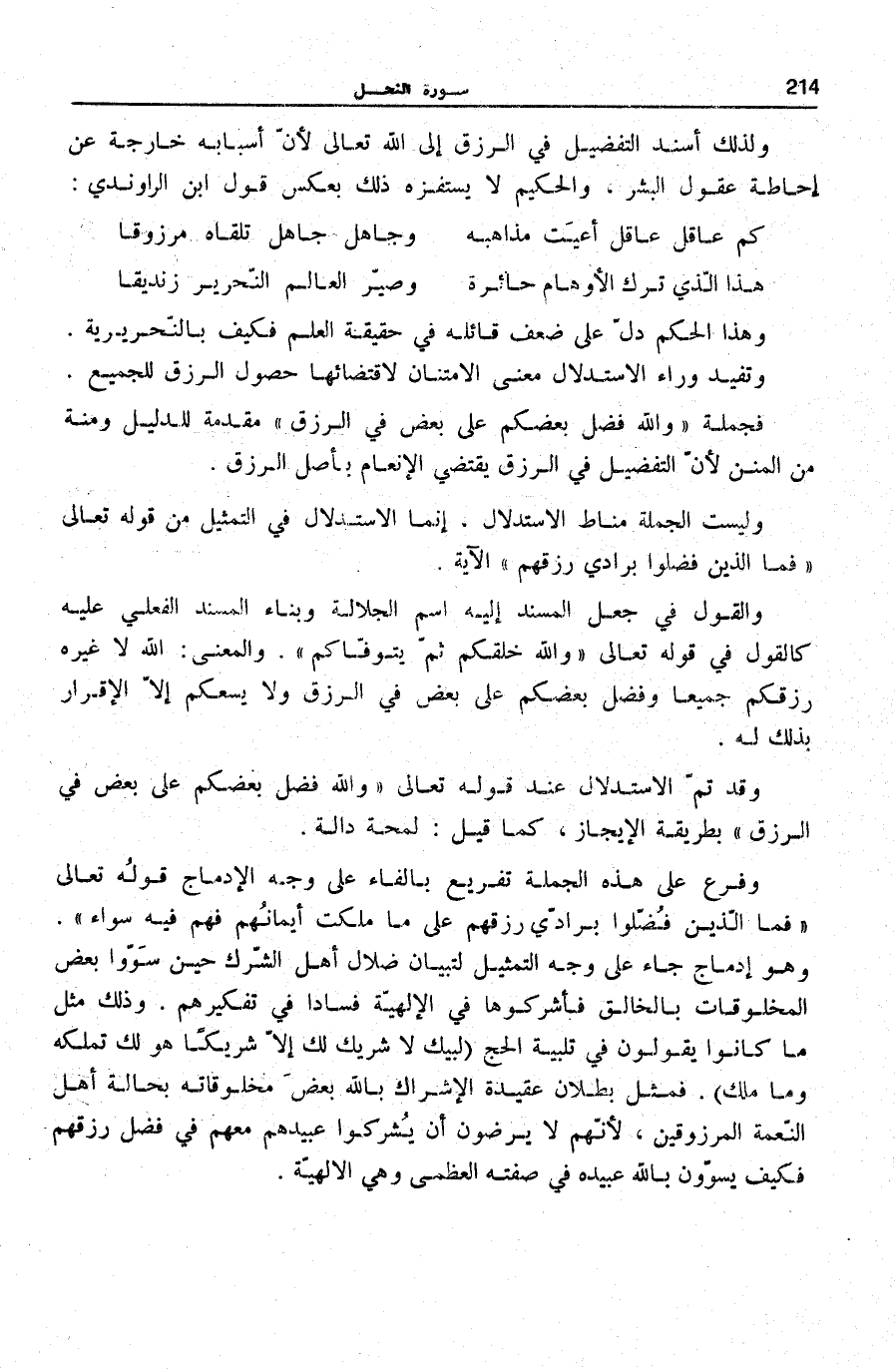 وَقَدْ تَمَّ الِاسْتِدْلَالُ عِنْدَ قَوْلِهِ تَعَالَى: وَاللَّهُ فَضَّلَ بَعْضَكُمْ عَلى بَعْضٍ فِي الرِّزْقِ بِطَرِيقَةِ الْإِيجَازِ، كَمَا قِيلَ: لَمْحَةٌ دَالَّةٌ.