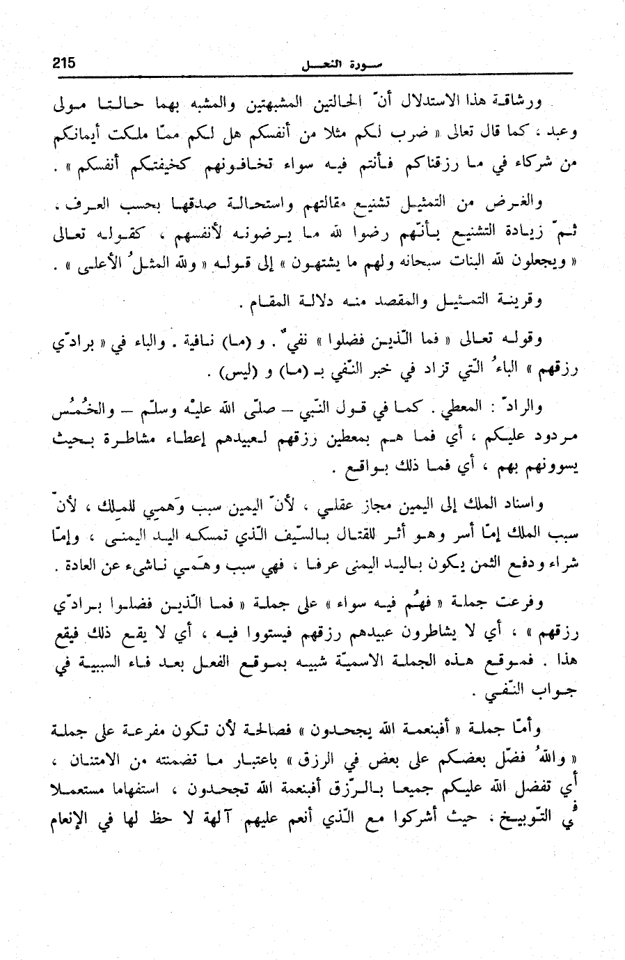 وَقَوْلُهُ تَعَالَى: فَمَا الَّذِينَ فُضِّلُوا نَفْيٌ. وَ (مَا) نَافِيَةٌ، وَالْبَاءُ فِي بِرَادِّي رِزْقِهِمْ الْبَاءُ الَّتِي تُزَادُ فِي خَبَرِ النَّفْيِ بِ (مَا) وَ (لَيْسَ) .