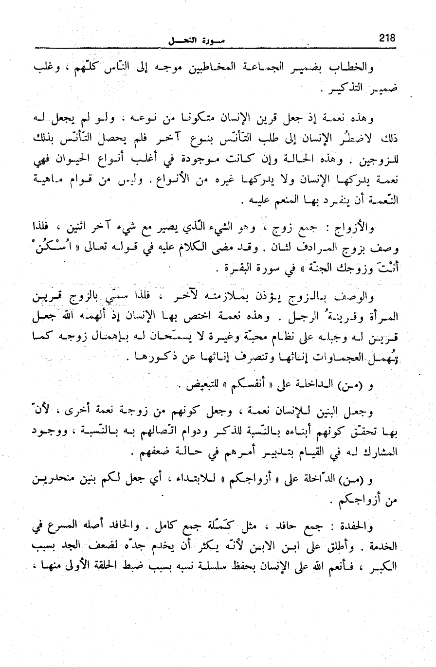 وَهَذِهِ نِعْمَةٌ اخْتُصَّ بِهَا الْإِنْسَانُ إِذْ أَلْهَمَهُ اللَّهُ جَعْلَ قَرِينٍ لَهُ وَجَبَلَهُ عَلَى نِظَامِ مَحَبَّةٍ وَغَيْرِهِ لَا يَسْمَحَانِ لَهُ بِإِهْمَالِ زَوْجِهِ كَمَا تُهْمِلُ الْعَجْمَاوَاتُ إِنَاثَهَا وَتَنْصَرِفُ إِنَاثُهَا عَنْ ذُكُورِهَا.
