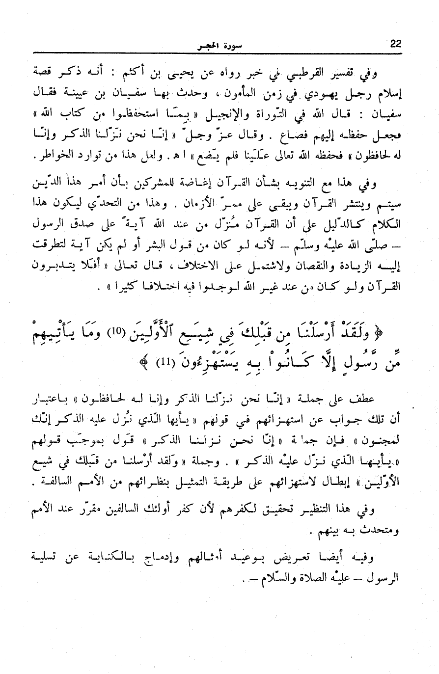 وَفِي تَفْسِيرِ «الْقُرْطُبِيِّ» فِي خَبَرٍ رَوَاهُ عَنْ يَحْيَى بْنِ أَكْثَمَ: أَنَّهُ ذَكَرَ قِصَّةَ إِسْلَامِ رَجُلٍ يَهُودِيٍّ فِي زَمَنِ الْمَأْمُونِ، وَحَدَّثَ بِهَا سُفْيَانَ بْنَ عُيَيْنَةَ فَقَالَ سُفْيَانُ: قَالَ اللَّهُ فِي التَّوْرَاةِ وَالْإِنْجِيلِ بِمَا اسْتُحْفِظُوا مِنْ كِتابِ اللَّهِ فَجَعَلَ حِفْظَهُ إِلَيْهِمْ فَضَاعَ. وَقَالَ عَزَّ وَجَلَّ: إِنَّا نَحْنُ نَزَّلْنَا الذِّكْرَ وَإِنَّا لَهُ لَحافِظُونَ فَحَفِظَهُ اللَّهُ تَعَالَى عَلَيْنَا فَلَمْ يَضِعْ» اه. وَلَعَلَّ هَذَا مِنْ تَوَارُدِ الْخَوَاطِرِ.