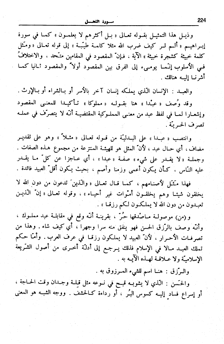 وَانْتَصَبَ عَبْداً عَلَى الْبَدَلِيَّةِ مِنْ قَوْلِهِ تَعَالَى: مَثَلًا وَهُوَ عَلَى تَقْدِيرِ مُضَافٍ، أَي حَال بعد، لِأَنَّ الْمَثَلَ هُوَ لِلْهَيْئَةِ الْمُنْتَزَعَةِ مِنْ مَجْمُوعِ هَذِهِ الصِّفَاتِ. وَجُمْلَةُ لَا يَقْدِرُ عَلى شَيْءٍ صِفَةُ عَبْداً، أَيْ عَاجِزًا عَنْ كُلِّ مَا يَقْدِرُ عَلَيْهِ النَّاسُ، كَأَنْ يَكُونُ أَعْمَى وَزَمِنًا وَأَصَمَّ، بِحَيْثُ يَكُونُ أَقَلَّ الْعَبِيدِ فَائِدَةً.