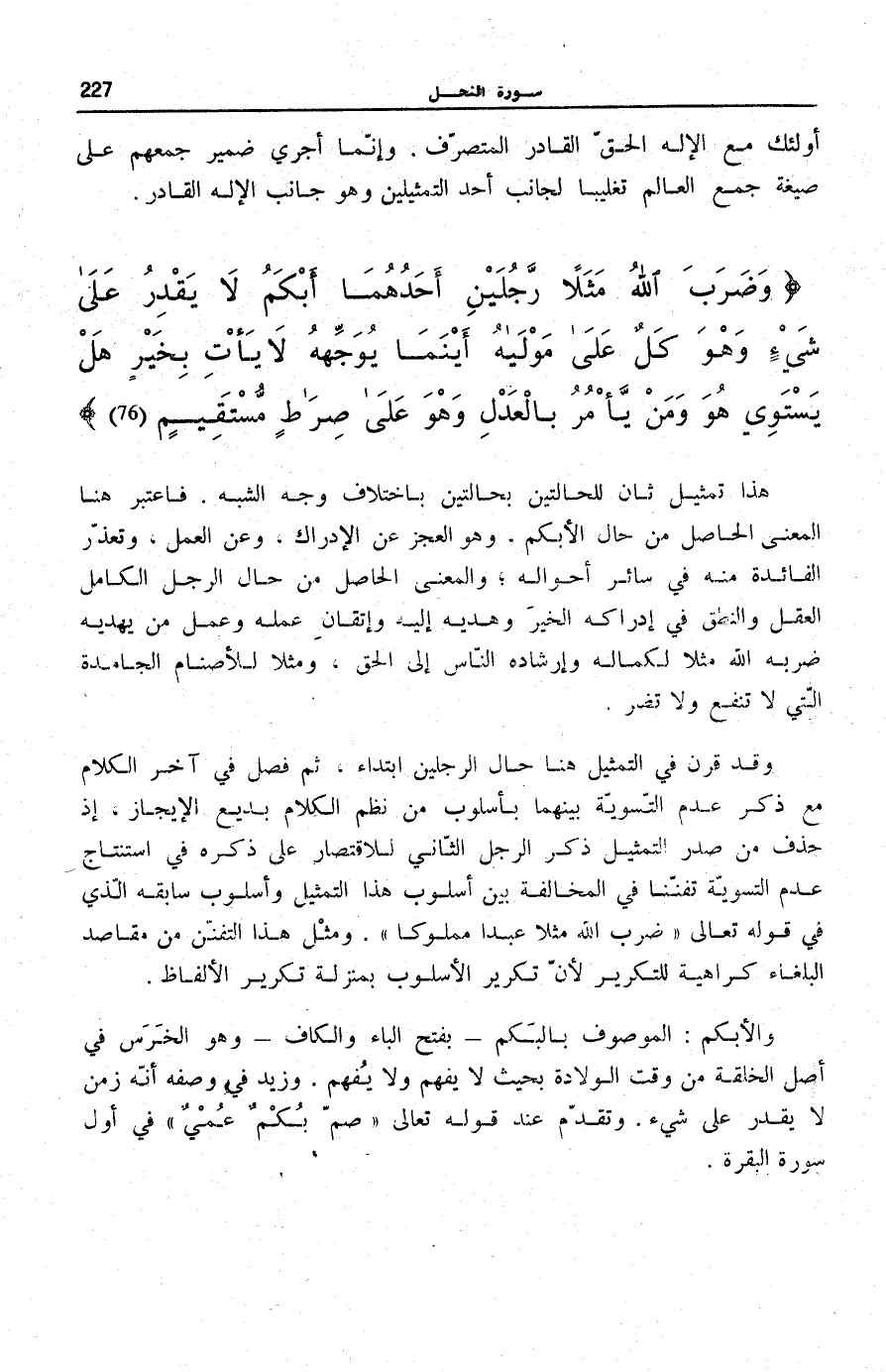 وَضَرَبَ اللَّهُ مَثَلاً رَجُلَيْنِ أَحَدُهُما أَبْكَمُ لَا يَقْدِرُ عَلى شَيْءٍ وَهُوَ كَلٌّ عَلى مَوْلاهُ أَيْنَما يُوَجِّهْهُ لَا يَأْتِ بِخَيْرٍ هَلْ يَسْتَوِي هُوَ وَمَنْ يَأْمُرُ بِالْعَدْلِ وَهُوَ عَلى صِراطٍ مُسْتَقِيمٍ (76)
