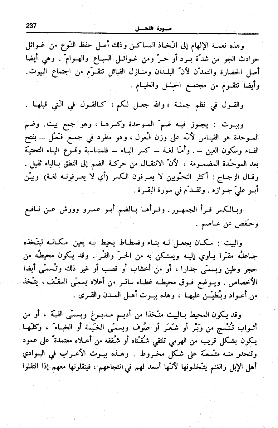 وَهَذِهِ نِعْمَةُ الْإِلْهَامِ إِلَى اتِّخَاذِ الْمَسَاكِنِ وَذَلِكَ أَصْلُ حِفْظِ النَّوْعِ مِنْ غَوَائِلِ حَوَادِثِ الْجَوِّ مِنْ شِدَّةِ بَرْدٍ أَوْ حَرٍّ وَمِنْ غَوَائِلِ السِّبَاعِ وَالْهَوَامِ. وَهِيَ أَيْضًا أَصْلُ الْحَضَارَةِ وَالتَّمَدُّنِ لِأَنَّ الْبُلْدَانَ وَمَنَازِلَ الْقَبَائِلِ تَتَقَوَّمُ مِنِ اجْتِمَاعِ الْبُيُوتِ. وَأَيْضًا تَتَقَوَّمُ مِنْ مُجْتَمَعِ الْحُلَلِ وَالْخِيَامِ.