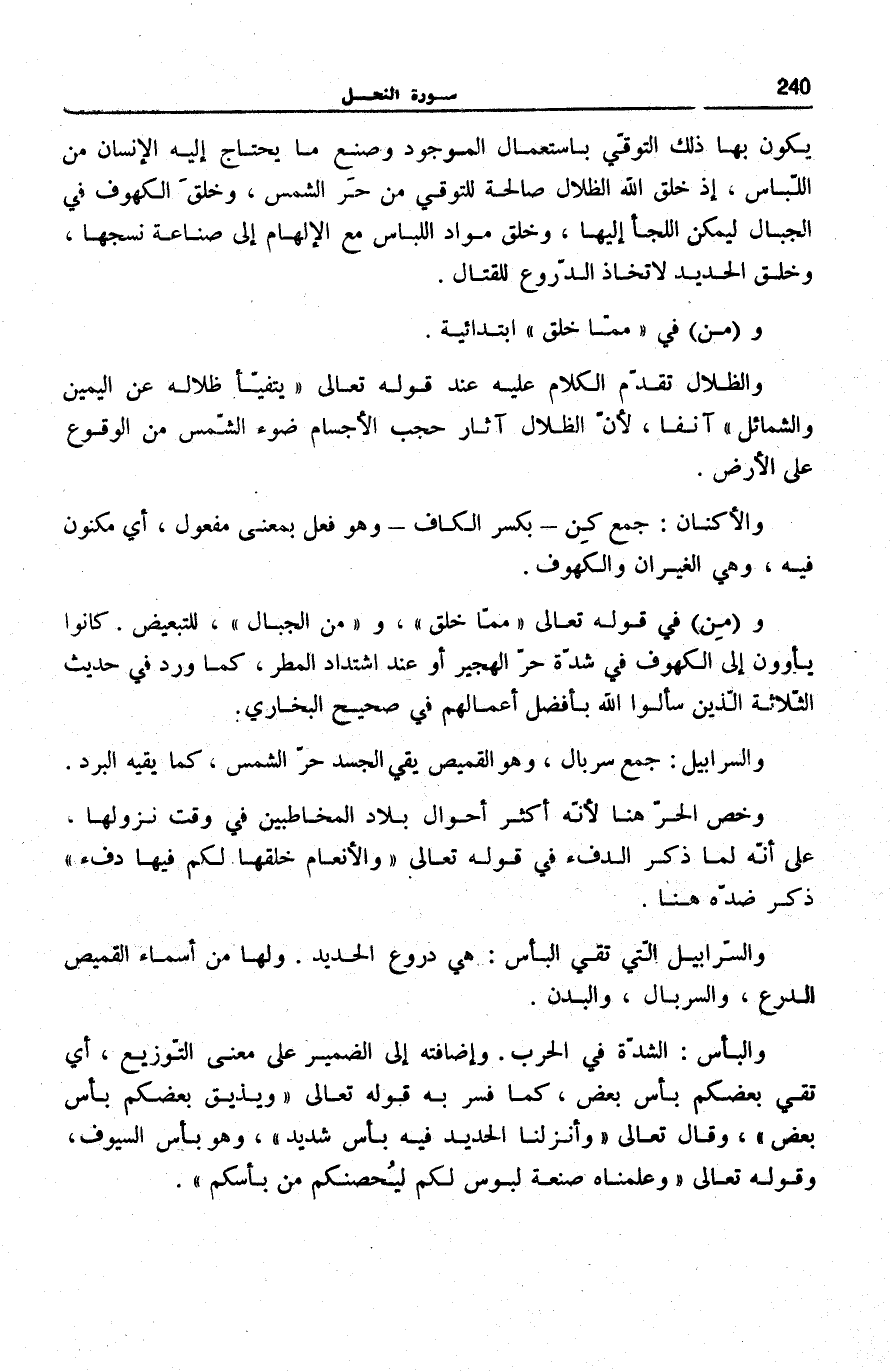 وَ (مِنْ) فِي قَوْلِهِ تَعَالَى: مِمَّا خَلَقَ، ومِنَ الْجِبالِ، لِلتَّبْعِيضِ. كَانُوا يَأْوُونَ إِلَى الْكُهُوفِ فِي شِدَّةِ حَرِّ الْهَجِيرِ أَوْ عِنْدَ اشْتِدَادِ الْمَطَرِ، كَمَا وَرَدَ فِي حَدِيثِ الثَّلَاثَةِ الَّذِينَ سَأَلُوا اللَّهَ بِأَفْضَلِ أَعْمَالِهِمْ فِي «صَحِيحِ الْبُخَارِيِّ» .