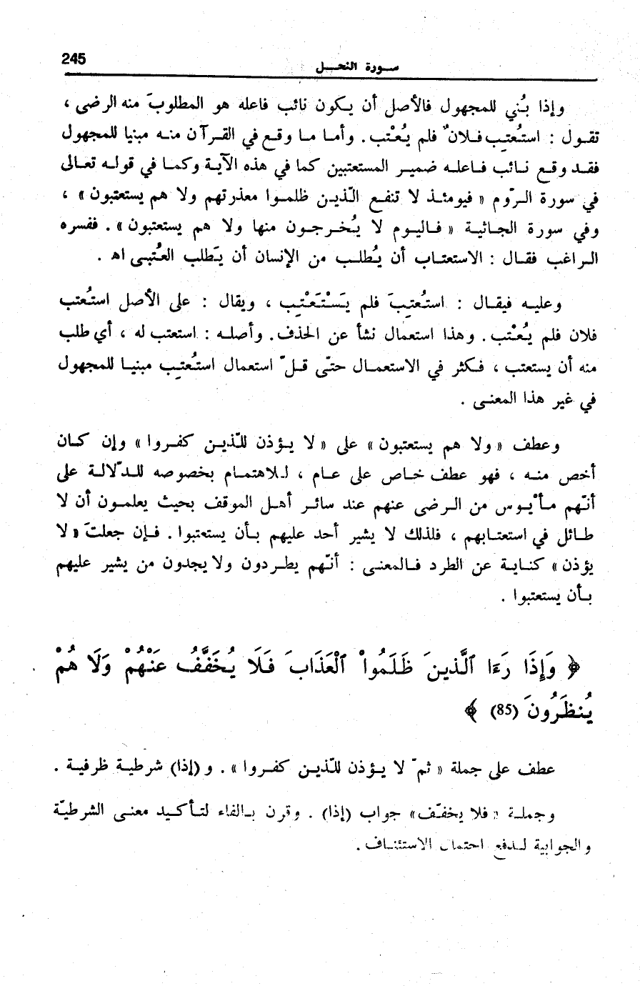 اسْتَعْتَبَ فُلَانٌ فَلَمْ يَعْتِبْ. وَأَمَّا مَا وَقَعَ فِي الْقُرْآنِ مِنْهُ مَبْنِيًّا لِلْمَجْهُولِ فَقَدْ وَقَعَ نَائِبُ فَاعِلِهِ ضَمِيرَ الْمُسْتَعْتِبِينَ كَمَا فِي هَذِهِ الْآيَةِ، وَكَمَا فِي قَوْلِهِ تَعَالَى فِي سُورَةِ الرُّومِ [57] : فَيَوْمَئِذٍ لَا تَنْفَعُ الَّذِينَ ظَلَمُوا مَعْذِرَتُهُمْ وَلا هُمْ يُسْتَعْتَبُونَ، وَفِي سُورَةِ الْجَاثِيَةِ [35] : فَالْيَوْمَ لَا يُخْرَجُونَ مِنْها وَلا هُمْ يُسْتَعْتَبُونَ. فَفَسَّرَهُ الرَّاغِبُ فَقَالَ: الِاسْتِعْتَابُ أَنْ يُطْلَبَ مِنَ الْإِنْسَانِ أَنْ يَطْلُبَ الْعُتْبَى اه.