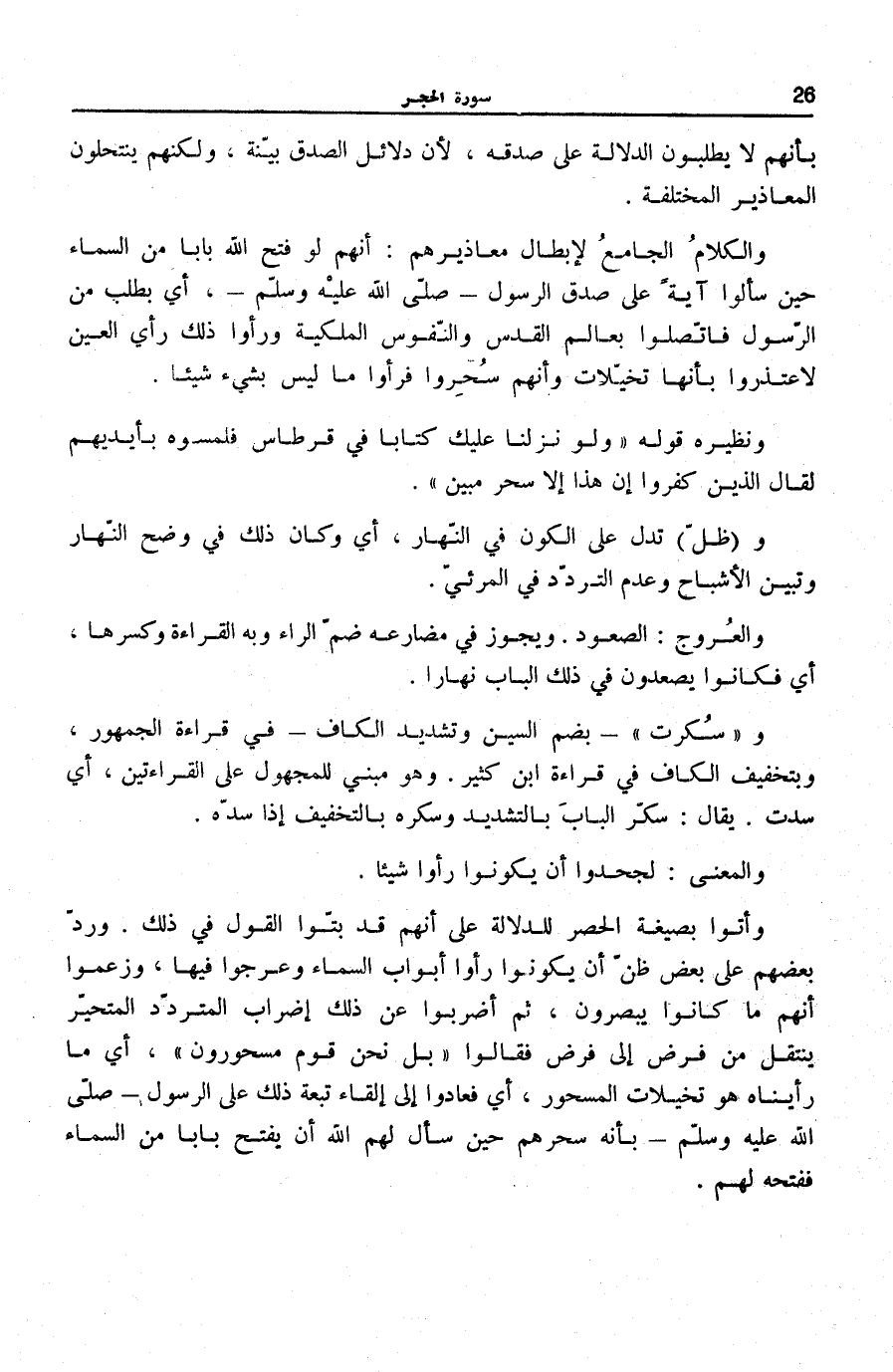 وَأَتَوْا بِصِيغَةِ الْحَصْرِ لِلدَّلَالَةِ عَلَى أَنَّهُمْ قَدْ بَتُّوا الْقَوْلَ فِي ذَلِكَ. وَرَدُّ بَعْضِهِمْ عَلَى بَعْضٍ ظَنٌّ أَنْ يَكُونُوا رَأَوْا أَبْوَابَ السَّمَاءِ وَعَرَجُوا فِيهَا، وَزَعَمُوا أَنَّهُمْ مَا كَانُوا يُبْصِرُونَ، ثُمَّ أَضْرَبُوا عَنْ ذَلِكَ إِضْرَابَ الْمُتَرَدِّدِ الْمُتَحَيِّرِ يَنْتَقِلُ مِنْ فَرْضٍ إِلَى فَرْضٍ فَقَالُوا: بَلْ نَحْنُ قَوْمٌ مَسْحُورُونَ، أَيْ مَا رَأَيْنَاهُ هُوَ تَخَيُّلَاتِ الْمَسْحُورِ، أَيْ فَعَادُوا إِلَى إِلْقَاءِ تَبِعَةِ ذَلِكَ عَلَى الرَّسُولِ صَلَّى اللهُ عَلَيْهِ وَسَلَّمَ بِأَنَّهُ سَحَرَهُمْ حِينَ سَأَلَ لَهُمُ اللَّهَ أَنْ يَفْتَحَ بَابًا مِنَ السَّمَاءِ فَفَتَحَهُ لَهُمْ.