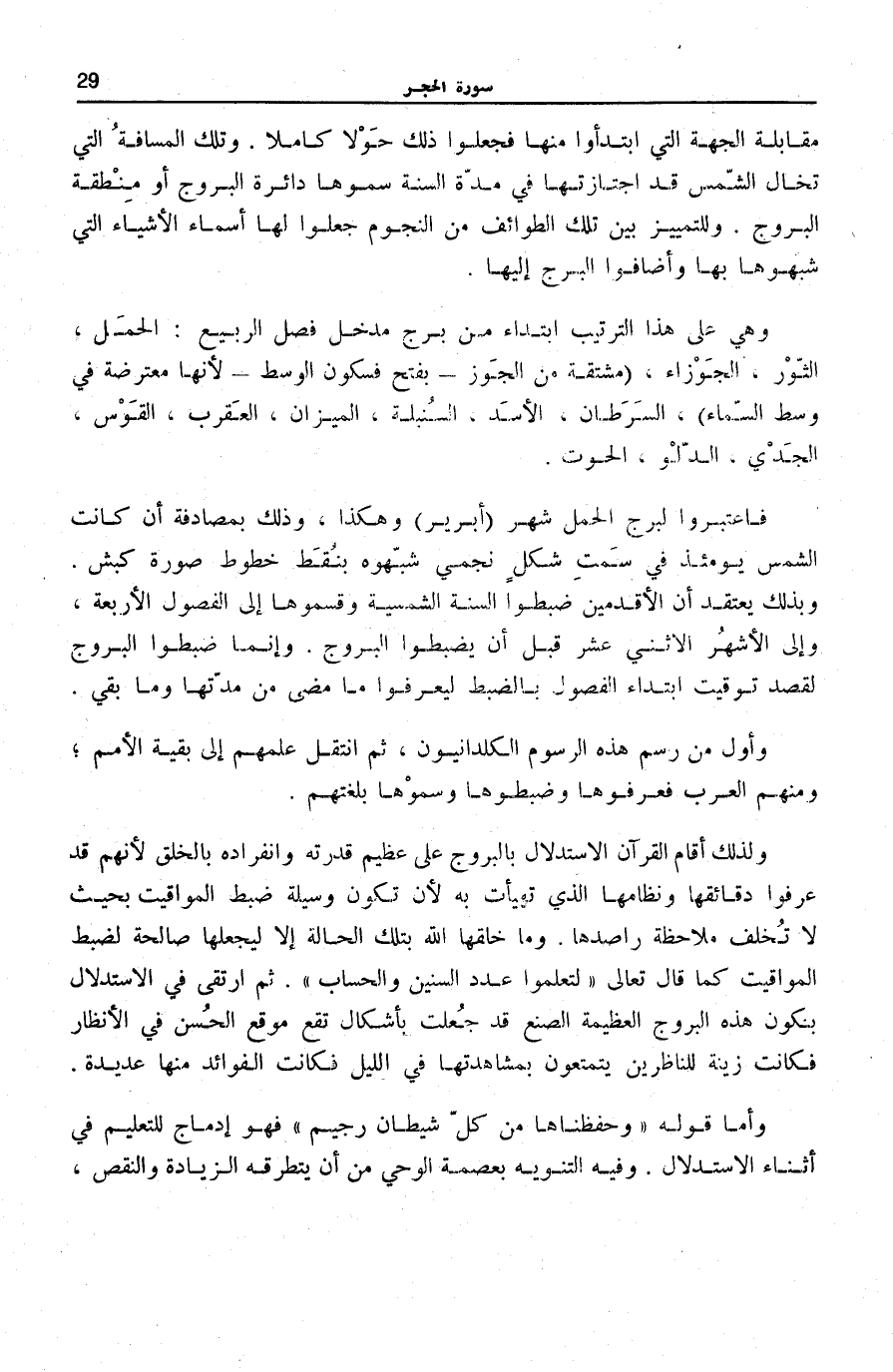 مُقَابِلَةِ الْجِهَةِ الَّتِي ابْتَدَأُوا مِنْهَا فَجَعَلُوا ذَلِكَ حَوْلًا كَامِلًا. وَتِلْكَ الْمَسَافَةُ الَّتِي تُخَالُ الشَّمْسُ قَدِ اجْتَازَتْهَا فِي مُدَّةِ السَّنَةِ سَمَّوْهَا دَائِرَةَ الْبُرُوجِ أَوْ مِنْطَقَةَ الْبُرُوجِ. وَلِلتَّمْيِيزِ بَيْنَ تِلْكَ الطَّوَائِفِ مِنَ النُّجُومِ جَعَلُوا لَهَا أَسْمَاءَ الْأَشْيَاءِ الَّتِي شَبَّهُوهَا بِهَا وَأَضَافُوا الْبُرْجَ إِلَيْهَا.