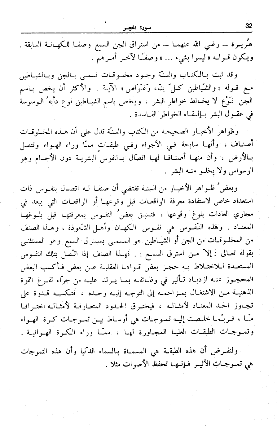 وَظَوَاهِرُ الْأَخْبَارِ الصَّحِيحَةِ مِنَ الْكِتَابِ وَالسُّنَّةِ تَدُلُّ عَلَى أَنَّ هَذِهِ الْمَخْلُوقَاتِ أَصْنَافٌ، وَأَنَّهَا سَابِحَةٌ فِي الْأَجْوَاءِ وَفِي طَبَقَاتٍ مِمَّا وَرَاءَ الْهَوَاءِ وَتَتَّصِلُ بِالْأَرْضِ، وَأَنَّ مِنْهَا أَصْنَافًا لَهَا اتِّصَالٌ بِالنُّفُوسِ الْبَشَرِيَّةِ دُونَ الْأَجْسَامِ وَهُوَ الْوَسْوَاسُ وَلَا يَخْلُو مِنْهُ الْبَشَرُ.