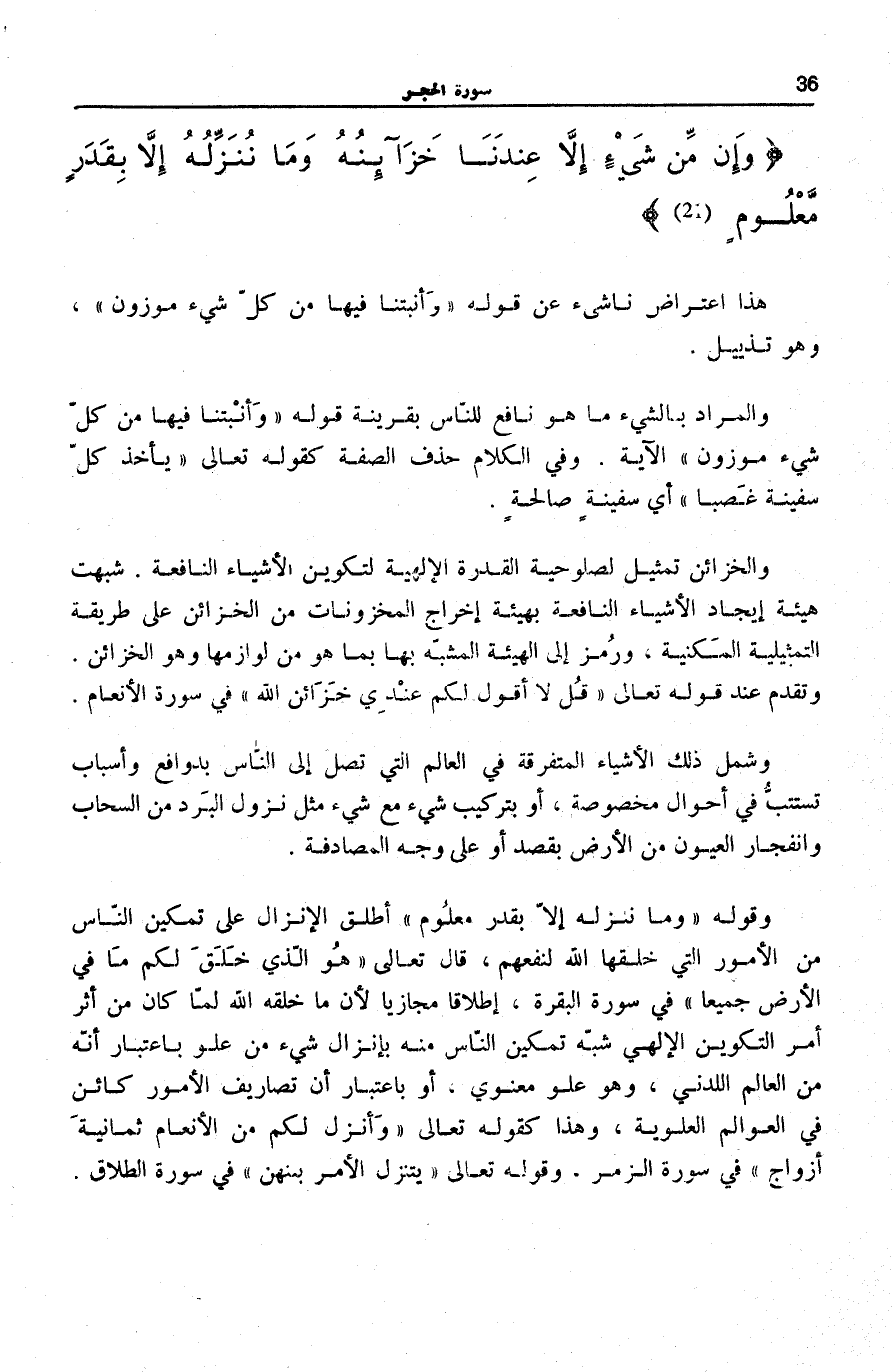 وَقَوْلُهُ وَما نُنَزِّلُهُ إِلَّا بِقَدَرٍ مَعْلُومٍ أُطْلِقَ الْإِنْزَالُ عَلَى تَمْكِينِ النَّاسِ مِنَ الْأُمُورِ الَّتِي خَلَقَهَا اللَّهُ لِنَفْعِهِمْ، قَالَ تَعَالَى هُوَ الَّذِي خَلَقَ لَكُمْ مَا فِي الْأَرْضِ جَمِيعاً فِي سُورَةِ الْبَقَرَةِ [29] ، إِطْلَاقًا مَجَازِيًّا لِأَنَّ مَا خَلَقَهُ اللَّهُ لَمَّا كَانَ مِنْ أَثَرِ أَمْرِ التَّكْوِينِ الْإِلَهِيِّ شَبَّهَ تَمْكِينَ النَّاسِ مِنْهُ بِإِنْزَالِ شَيْءٍ مِنْ عُلُوٍّ بِاعْتِبَارِ أَنَّهُ مِنَ الْعَالَمِ اللَّدُنِّيِّ، وَهُوَ عُلُوٌّ مَعْنَوِيٌّ، أَوْ بِاعْتِبَارِ أَنَّ تَصَارِيفَ الْأُمُورِ كَائِنٌ فِي الْعَوَالِمِ الْعُلْوِيَّةِ، وَهَذَا كَقَوْلِهِ تَعَالَى وَأَنْزَلَ لَكُمْ مِنَ الْأَنْعامِ ثَمانِيَةَ أَزْواجٍ فِي سُورَةِ الزُّمُرِ [6] ، وَقَوْلِهِ تَعَالَى يَتَنَزَّلُ الْأَمْرُ بَيْنَهُنَّ فِي سُورَةِ الطَّلَاقِ
