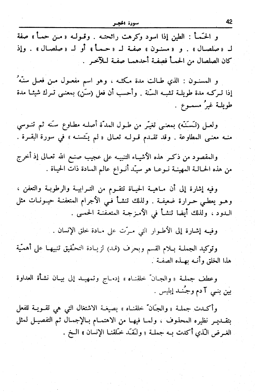 وَأُكِّدَتْ جُمْلَةُ وَالْجَانَّ خَلَقْناهُ بِصِيغَةِ الِاشْتِغَالِ الَّتِي هِيَ تَقْوِيَةٌ للْفِعْل بِتَقْدِير نَظِيره الْمَحْذُوفِ، وَلِمَا فِيهَا مِنَ الِاهْتِمَامِ بِالْإِجْمَالِ ثُمَّ التَّفْصِيلِ لِمِثْلِ الْغَرَضِ الَّذِي أُكِّدَتْ بِهِ جُمْلَةُ وَلَقَدْ خَلَقْنَا الْإِنْسانَ الْخَ.