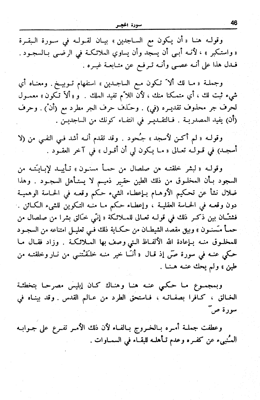 إِنِّي خالِقٌ بَشَراً مِنْ صَلْصالٍ مِنْ حَمَإٍ مَسْنُونٍ وَبَيْنَ مَقْصِدِ الشَّيْطَانِ مِنْ حِكَايَةِ ذَلِكَ فِي تَعْلِيلِ امْتِنَاعِهِ مِنَ السُّجُودِ لِلْمَخْلُوقِ مِنْهُ بِإِعَادَةِ اللَّهِ الْأَلْفَاظَ الَّتِي وَصَفَ بِهَا الْمَلَائِكَةَ. وَزَادَ فَقَالَ مَا حُكِيَ عَنْهُ فِي سُورَةِ ص [76] إِذْ قَالَ: أَنَا خَيْرٌ مِنْهُ خَلَقْتَنِي مِنْ نارٍ وَخَلَقْتَهُ مِنْ
