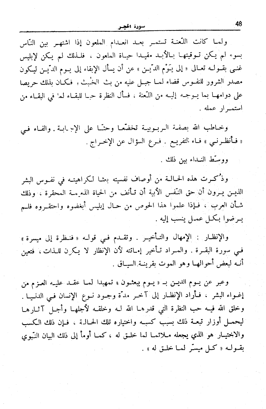عَنْ أَنْ يَسْأَلَ الْإِبْقَاءَ إِلَى يَوْمِ الدِّينِ لِيَكُونَ مَصْدَرَ الشُّرُورِ لِلنُّفُوسِ قَضَاءٌ لِمَا جُبِلَ عَلَيْهِ مِنْ بَثِّ الْخُبْثِ فَكَانَ بِذَلِكَ حَرِيصًا عَلَى دَوَامِهَا بِمَا يُوَجَّهُ إِلَيْهِ مِنَ اللَّعْنَةِ، فَسَأَلَ النَّظِرَةَ حُبًّا لِلْبَقَاءِ لِمَا فِي الْبَقَاءِ مِنَ اسْتِمْرَارِ عَمَلِهِ.