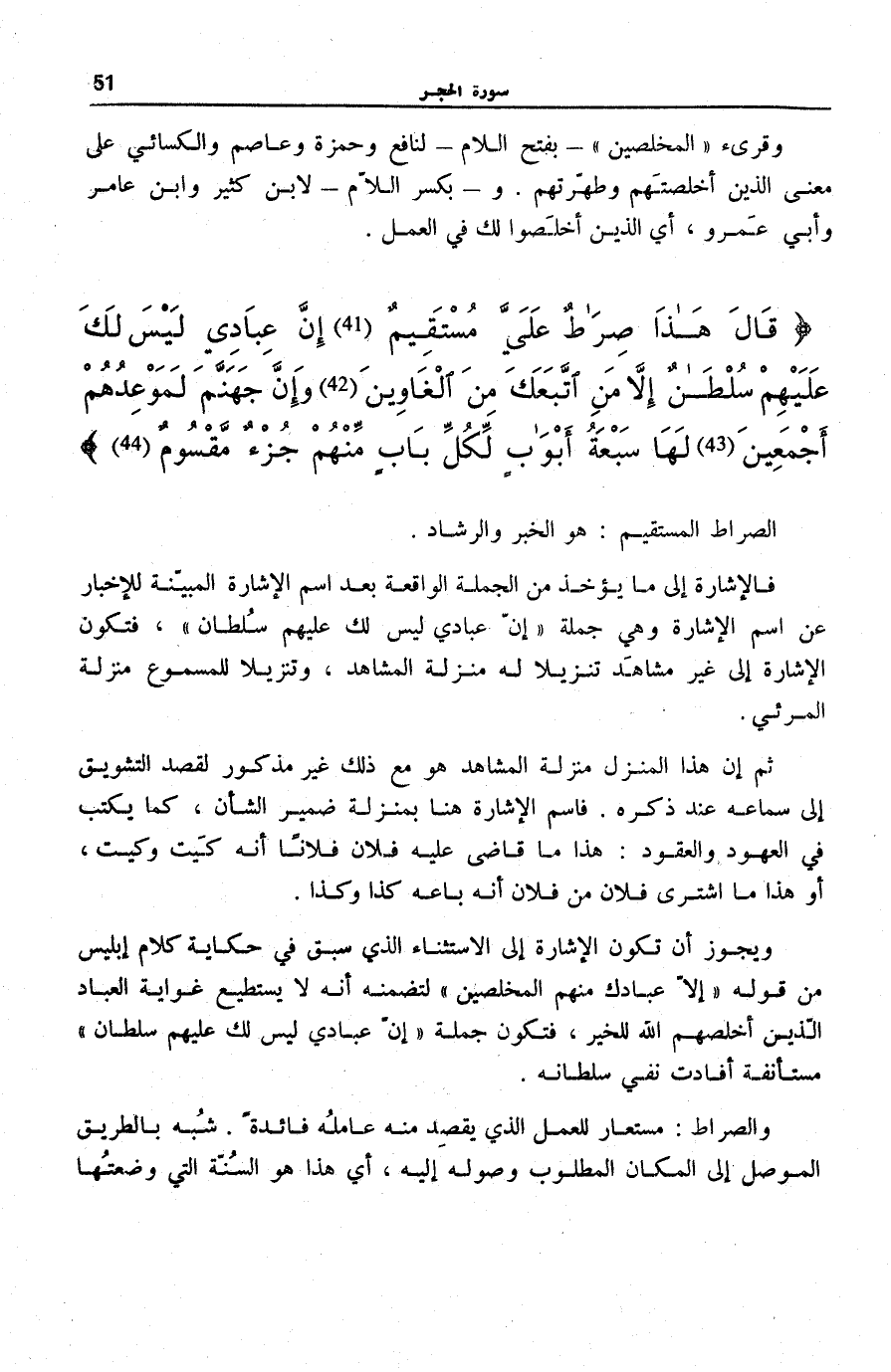 فَالْإِشَارَةُ إِلَى مَا يُؤْخَذُ مِنَ الْجُمْلَةِ الْوَاقِعَةِ بَعْدَ اسْمِ الْإِشَارَةِ الْمُبَيِّنَةِ لِلْإِخْبَارِ عَنِ اسْمِ الْإِشَارَةِ وَهِيَ جُمْلَةُ إِنَّ عِبادِي لَيْسَ لَكَ عَلَيْهِمْ سُلْطانٌ، فَتَكُونُ الْإِشَارَةُ إِلَى غَيْرِ مُشَاهَدٍ تَنْزِيلًا لَهُ مَنْزِلَةَ الْمُشَاهَدِ، وَتَنْزِيلًا لِلْمَسْمُوعِ مَنْزِلَةَ الْمَرْئِيِّ.