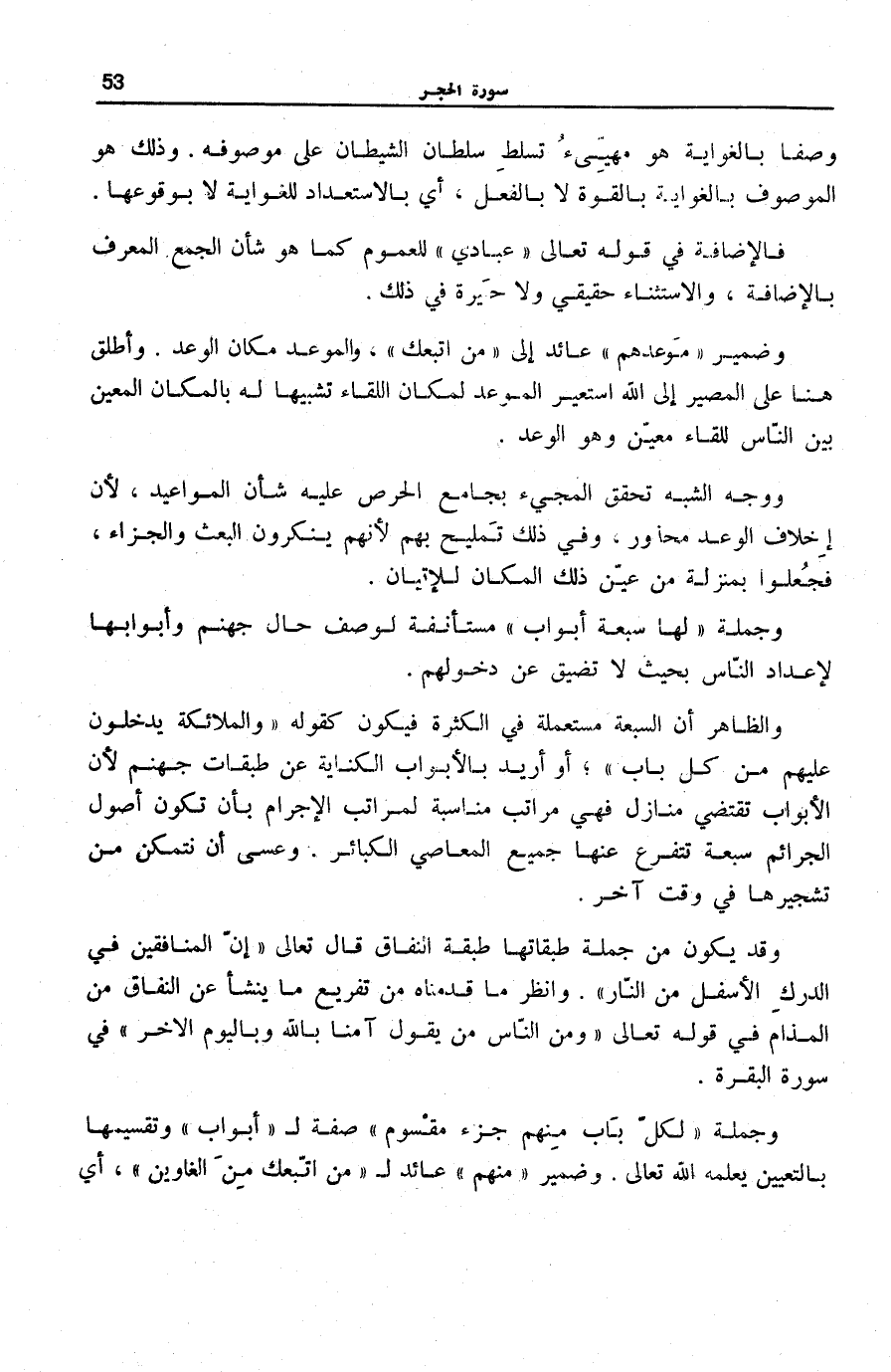 فَالْإِضَافَةُ فِي قَوْلِهِ تَعَالَى: عِبادِي لِلْعُمُومِ كَمَا هُوَ شَأْنُ الْجَمْعِ الْمُعَرَّفِ بِالْإِضَافَةِ، وَالِاسْتِثْنَاءُ حَقِيقِيٌّ وَلَا حَيْرَةَ فِي ذَلِكَ.