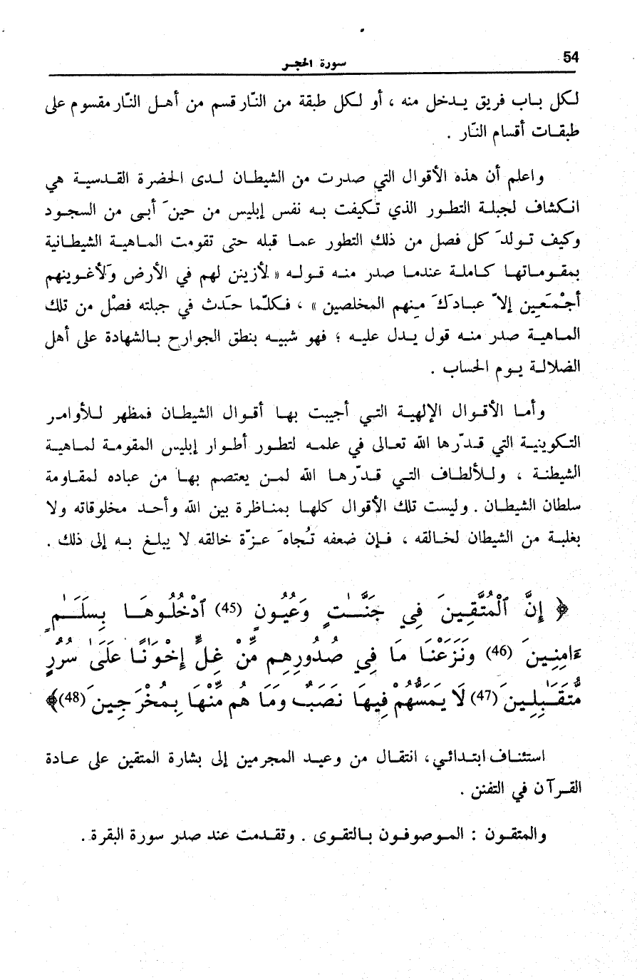 وَاعْلَمْ أَنَّ هَذِهِ الْأَقْوَالَ الَّتِي صَدَرَتْ مِنَ الشَّيْطَانِ لَدَى الْحَضْرَةِ الْقُدُسِيَّةِ هِيَ انْكِشَافٌ لِجِبِلَّةِ التَّطَوُّرِ الَّذِي تَكَيَّفَتْ بِهِ نَفْسُ إِبْلِيسَ مِنْ حِينِ أَبَى مِنَ السُّجُودِ وَكَيْفَ تَوَلَّدَ كُلُّ فَصْلٍ مِنْ ذَلِكَ التَّطَوُّرِ عَمَّا قَبْلَهُ حَتَّى تَقَوَّمَتِ الْمَاهِيَّةُ الشَّيْطَانِيَّةُ بمقوماتها كَامِلَة عِنْد مَا صَدَرَ مِنْهُ قَوْلُهُ: لَأُزَيِّنَنَّ لَهُمْ فِي الْأَرْضِ وَلَأُغْوِيَنَّهُمْ أَجْمَعِينَ إِلَّا عِبادَكَ مِنْهُمُ الْمُخْلَصِينَ [سُورَة