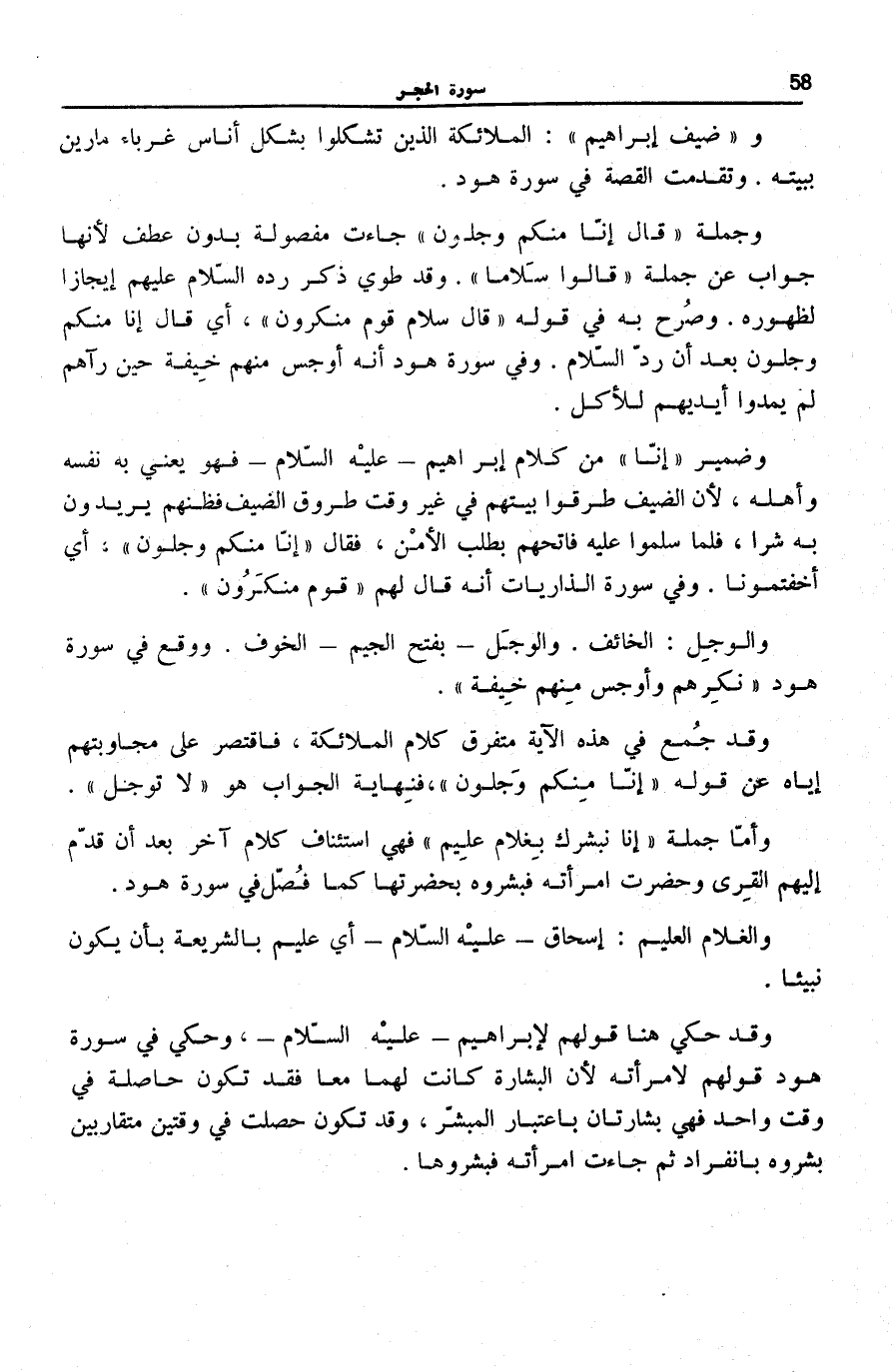 قالَ سَلامٌ قَوْمٌ مُنْكَرُونَ [سُورَة الذاريات: 25] ، أَيْ قَالَ إِنَّا مِنْكُمْ وَجِلُونَ بَعْدَ أَنْ رَدَّ السَّلَامَ. وَفِي سُورَةِ هُودٍ أَنَّهُ أَوْجَسَ مِنْهُمْ خِيفَةً حِينَ رَآهُمْ لَمْ يَمُدُّوا أَيْدِيَهُمْ لِلْأَكْلِ.