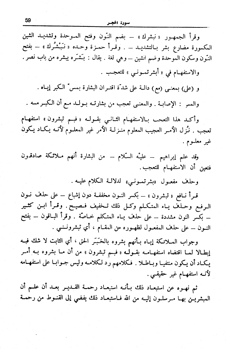 وَأُكِّدَ هَذَا التَّعَجُّبُ بِالِاسْتِفْهَامِ الثَّانِي بِقَوْلِهِ: فَبِمَ تُبَشِّرُونَ اسْتِفْهَامُ تَعَجُّبٍ. نَزَلَ الْأَمْرُ الْعَجِيبُ الْمَعْلُومُ مَنْزِلَةَ الْأَمْرِ غَيْرِ الْمَعْلُومِ لِأَنَّهُ يَكَادُ يَكُونُ غَيْرَ مَعْلُومٍ.