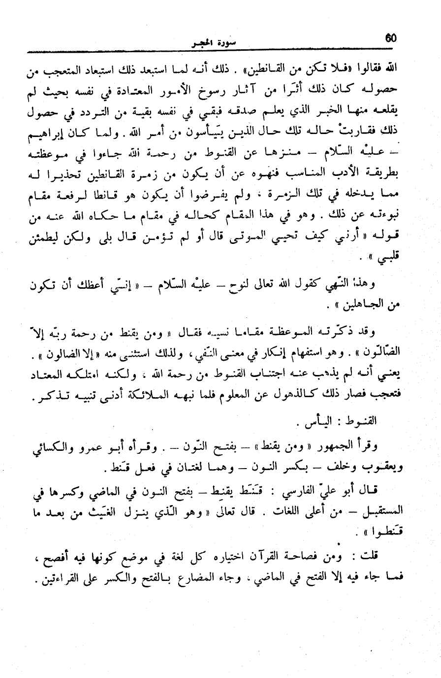 اللَّهِ فَقَالُوا: فَلا تَكُنْ مِنَ الْقانِطِينَ. ذَلِكَ أَنَّهُ لَمَّا اسْتَبْعَدَ ذَلِكَ اسْتِبْعَادَ الْمُتَعَجِّبِ مِنْ حُصُولِهِ كَانَ ذَلِكَ أَثَرًا مِنْ آثَارِ رُسُوخِ الْأُمُورِ الْمُعْتَادَةِ فِي نَفْسِهِ بِحَيْثُ لَمْ يُقْلِعْهُ مِنْهَا الْخَبَرُ الَّذِي يَعْلَمُ صِدْقَهُ فَبَقِيَ فِي نَفْسِهِ بَقِيَّةٌ مِنَ التَّرَدُّدِ فِي حُصُولِ ذَلِكَ فَقَارَبَتْ حَالُهُ تِلْكَ حَالَ الَّذِينَ يَيْأَسُونَ مِنْ أَمْرِ اللَّهِ. وَلَمَّا كَانَ إِبْرَاهِيمُ- عَلَيْهِ السَّلَام- منزّها عَن الْقُنُوطِ مِنْ رَحْمَةِ اللَّهِ جَاءُوا فِي مَوْعِظَتِهِ بِطَرِيقَةِ الْأَدَبِ الْمُنَاسِبِ فَنَهَوْهُ عَنْ أَنْ يَكُونَ مِنْ زُمْرَةِ الْقَانِطِينَ تَحْذِيرًا لَهُ مِمَّا يُدْخِلُهُ فِي تِلْكَ الزُّمْرَةِ، وَلَمْ يَفْرِضُوا أَنْ يَكُونَ هُوَ قَانِطًا لرفعة مقَام نبوءته عَنْ ذَلِكَ. وَهُوَ فِي هَذَا الْمَقَامِ كَحَالِهِ فِي مَقَامِ مَا حَكَاهُ اللَّهُ عَنْهُ مِنْ قَوْلِهِ: أَرِنِي كَيْفَ تُحْيِ الْمَوْتى قالَ أَوَلَمْ تُؤْمِنْ قالَ بَلى وَلكِنْ لِيَطْمَئِنَّ قَلْبِي [سُورَة الْبَقَرَة: 260] .