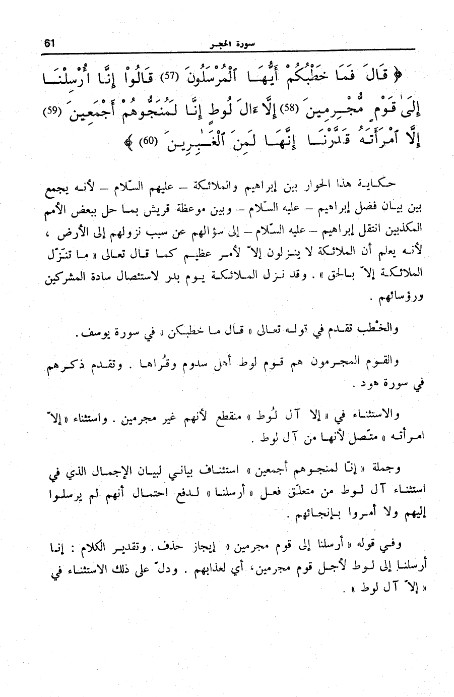قالَ فَما خَطْبُكُمْ أَيُّهَا الْمُرْسَلُونَ (57) قالُوا إِنَّا أُرْسِلْنا إِلى قَوْمٍ مُجْرِمِينَ (58) إِلاَّ آلَ لُوطٍ إِنَّا لَمُنَجُّوهُمْ أَجْمَعِينَ (59) إِلاَّ امْرَأَتَهُ قَدَّرْنا إِنَّها لَمِنَ الْغابِرِينَ (60)
