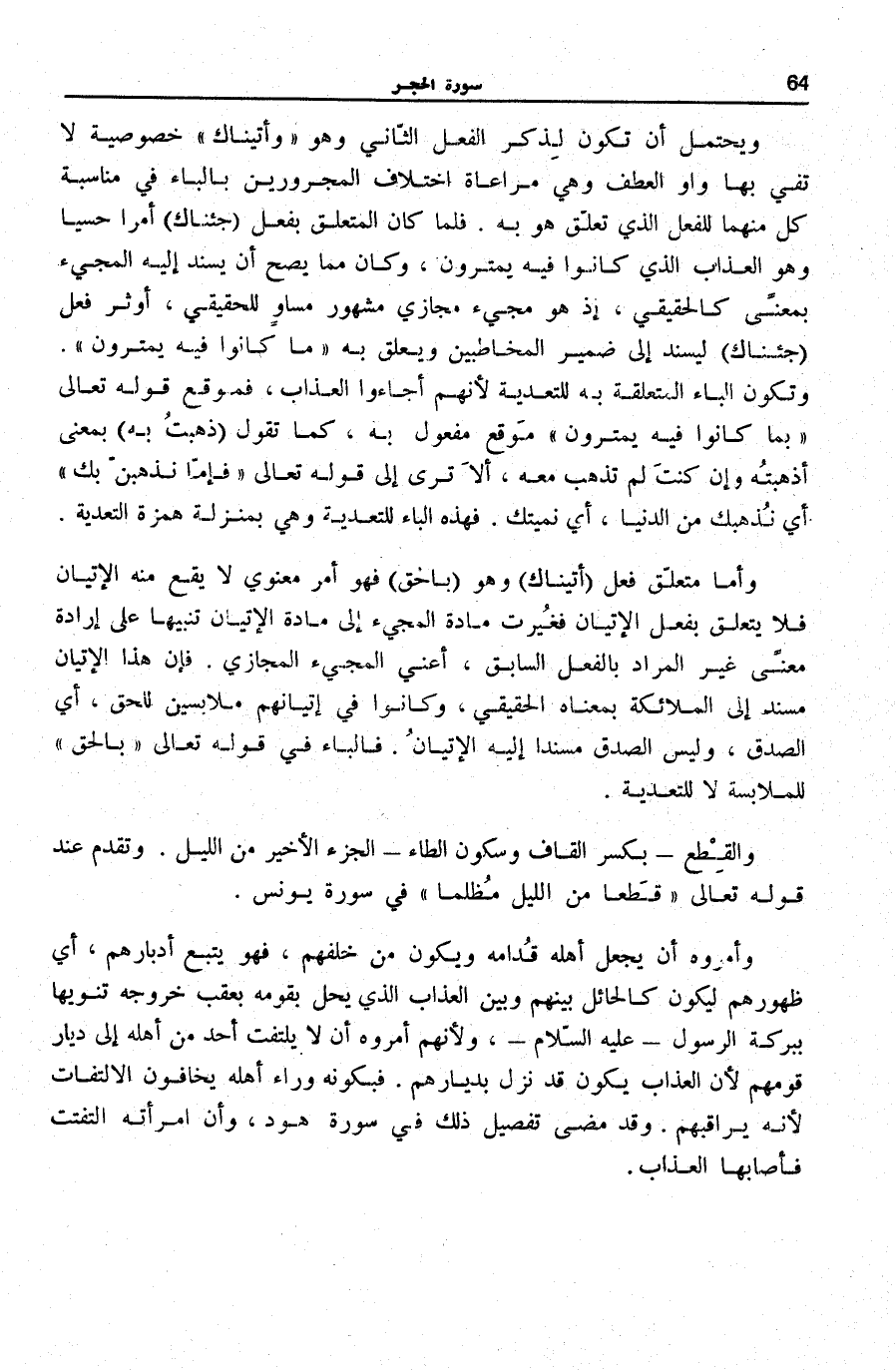 وَيُحْتَمَلُ أَنْ تَكُونَ لِذِكْرِ الْفِعْلِ الثَّانِي وَهُوَ وَأَتَيْناكَ خُصُوصِيَّةٌ لَا تَفِي بِهَا وَاوُ الْعَطْفِ وَهِيَ مُرَاعَاةُ اخْتِلَافِ الْمَجْرُورَيْنِ بِالْبَاءِ فِي مُنَاسبَة كل مِنْهُمَا لِلْفِعْلِ الَّذِي تَعَلَّقَ هُوَ بِهِ. فَلَمَّا كَانَ الْمُتَعَلِّقُ بِفِعْلِ جِئْناكَ أَمْرًا حِسِّيًّا وَهُوَ الْعَذَابُ الَّذِي كَانُوا فِيهِ يمترون، وَكَانَ مِمَّا يَصِحُّ أَنْ يُسْنَدَ إِلَيْهِ الْمَجِيءُ بِمَعْنَى كَالْحَقِيقِيِّ، إِذْ هُوَ مَجِيءٌ مَجَازِيٌّ مَشْهُورٌ مُسَاوٍ لِلْحَقِيقِيِّ، أُوثِرَ فِعْلُ جِئْناكَ لِيُسْنَدَ إِلَى ضَمِيرِ الْمُخَاطَبِينَ وَيُعَلَّقُ بِهِ «مَا كَانُوا فِيهِ يَمْتَرُونَ» . وَتَكُونُ الْبَاءُ الْمُتَعَلّقَة بِهِ للتعدية لِأَنَّهُمْ أجاءوا الْعَذَاب، فموقع قَوْلُهُ تَعَالَى: بِما كانُوا فِيهِ يَمْتَرُونَ مَوْقِعُ مَفْعُولٍ بِهِ، كَمَا تَقُولُ (ذَهَبْتُ بِهِ) بِمَعْنَى أَذْهَبْتُهُ وَإِنْ كُنْتَ لَمْ تَذْهَبْ مَعَهُ، أَلَا تَرَى إِلَى قَوْلِهِ تَعَالَى: فَإِمَّا نَذْهَبَنَّ بِكَ [سُورَة الزخرف: 41] أَيْ نُذْهِبُكَ مِنَ الدُّنْيَا، أَيْ نُمِيتُكَ. فَهَذِهِ الْبَاءُ لِلتَّعْدِيَةِ وَهِيَ بِمَنْزِلَةِ هَمْزَةِ التَّعْدِيَةِ.