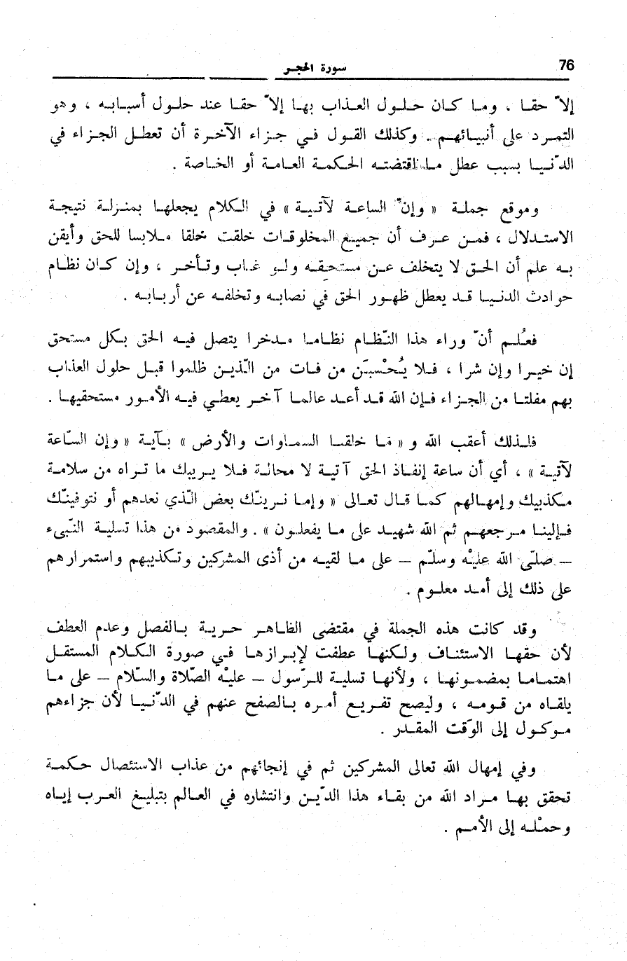 فَلِذَلِكَ أعقب الله ووَ مَا خَلَقْنَا السَّماواتِ وَالْأَرْضَ بِآيَةِ وَإِنَّ السَّاعَةَ لَآتِيَةٌ، أَيْ أَنَّ سَاعَةَ إِنْفَاذِ الْحَقِّ آتِيَةٌ لَا مَحَالَةَ فَلَا يُرِيبُكَ مَا تَرَاهُ مِنْ سَلَامَةِ مُكَذِّبِيكَ وَإِمْهَالِهِمْ كَمَا قَالَ تَعَالَى: وَإِمَّا نُرِيَنَّكَ بَعْضَ الَّذِي نَعِدُهُمْ أَوْ نَتَوَفَّيَنَّكَ فَإِلَيْنا مَرْجِعُهُمْ ثُمَّ اللَّهُ شَهِيدٌ عَلى مَا يَفْعَلُونَ [سُورَة يُونُس: 41] . وَالْمَقْصُودُ مِنْ هَذَا تَسْلِيَةُ النَّبِيءِ صَلَّى اللهُ عَلَيْهِ وَسَلَّمَ عَلَى مَا لَقِيَهُ مِنْ أَذَى الْمُشْرِكِينَ وَتَكْذِيبِهِمْ وَاسْتِمْرَارِهِمْ عَلَى ذَلِكَ إِلَى أَمَدٍ مَعْلُومٍ.