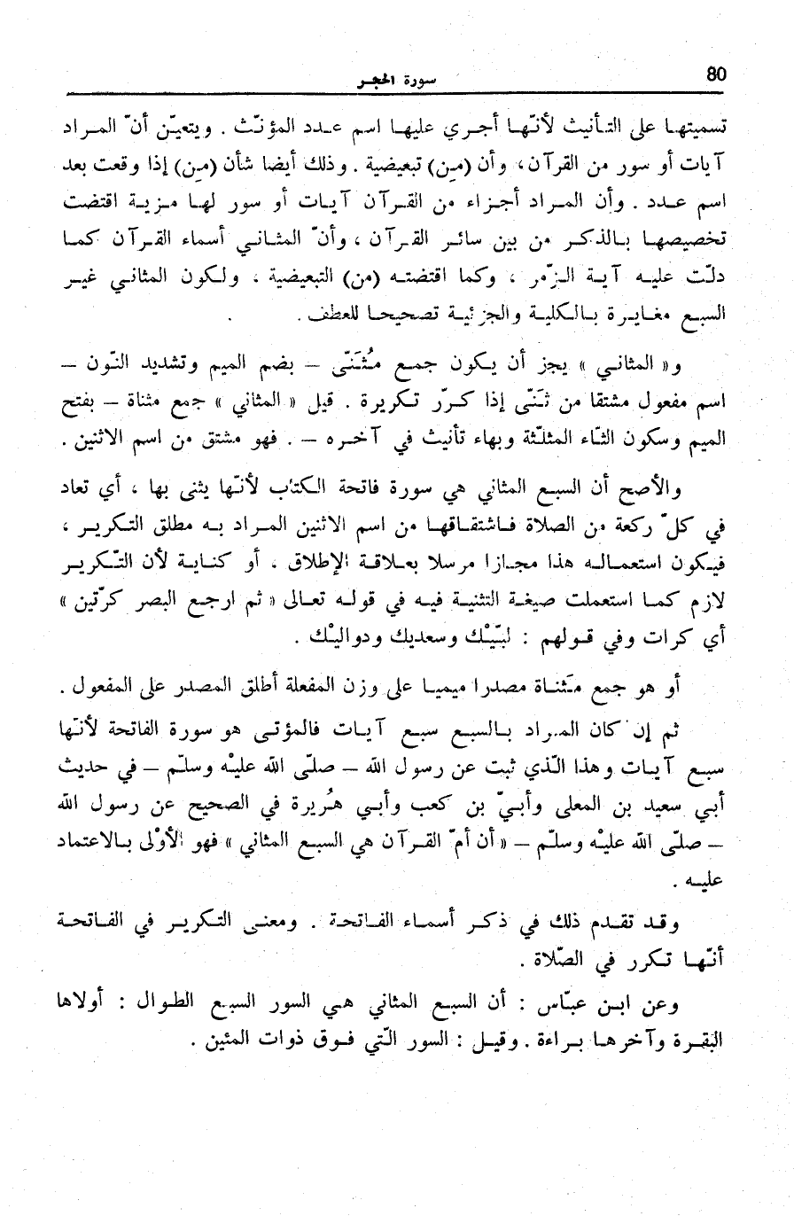 أُجْرِيَ عَلَيْهَا اسْمُ عَدَدِ الْمُؤَنَّثِ. وَيَتَعَيَّنُ أَنَّ الْمُرَادَ آيَاتٌ أَوْ سُوَرٌ مِنَ الْقُرْآنِ، وَأَنَّ مِنَ تَبْعِيضِيَّةٌ. وَذَلِكَ أَيْضًا شَأْنُ مِنَ إِذَا وَقَعَتْ بَعْدَ اسْمِ عَدَدٍ. وَأَنَّ الْمُرَادَ أَجْزَاءٌ مِنَ الْقُرْآنِ آيَاتٌ أَوْ سُوَرٌ لَهَا مَزِيَّةٌ اقْتَضَتْ تَخْصِيصَهَا بِالذِّكْرِ مِنْ بَيْنِ سَائِرِ الْقُرْآنِ، وَأَنَّ الْمَثَانِيَ أَسْمَاءُ الْقُرْآنِ كَمَا دَلَّتْ عَلَيْهِ آيَةُ الزُّمَرِ، وَكَمَا اقْتَضَتْهُ مِنَ التَّبْعِيضِيَّةُ، وَلِكَوْنِ الْمَثَانِي غَيْرَ السَّبْعِ مُغَايَرَةً بِالْكُلِّيَّةِ وَالْجُزْئِيَّةِ تَصْحِيحًا لِلْعَطْفِ.
