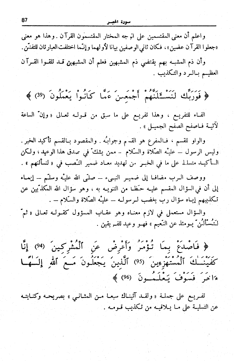 وَالْوَاوُ لِلْقَسَمِ، فَالْمُفَرَّعُ هُوَ الْقَسَمُ وَجَوَابُهُ. وَالْمَقْصُودُ بِالْقَسَمِ تَأْكِيدُ الْخَبَرِ. وَلَيْسَ الرَّسُول- عَلَيْهِ الصَّلَاة وَالسَّلَام- مِمَّنْ يَشُكُّ فِي صِدْقِ هَذَا الْوَعِيدِ وَلَكِنَّ التَّأْكِيدَ مُتَسَلِّطٌ عَلَى مَا فِي الْخَبَرِ مِنْ تَهْدِيدِ مُعَادِ ضَمِيرِ النصب فِي لَنَسْئَلَنَّهُمْ.