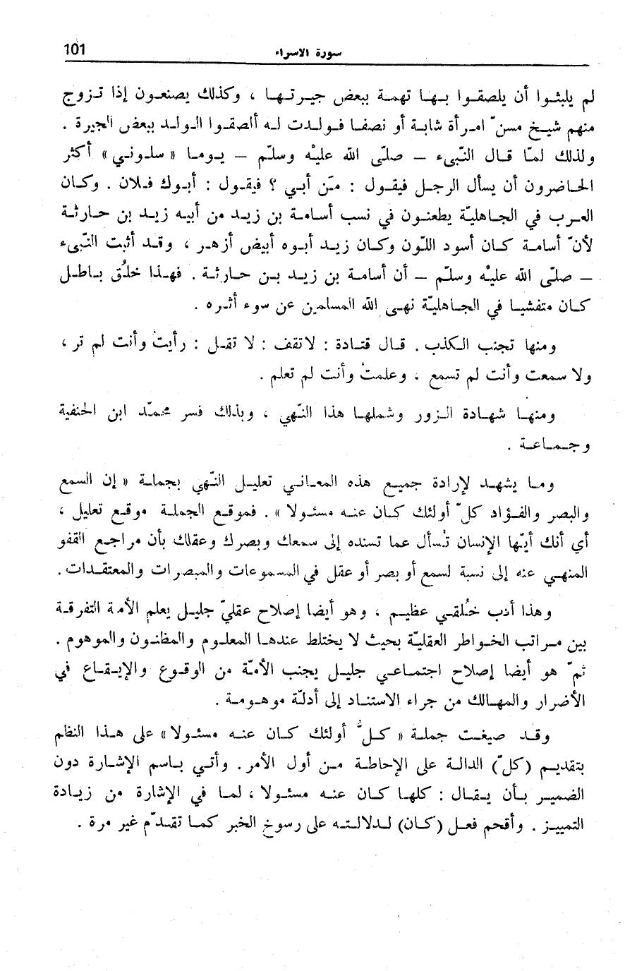 وَمَا يَشْهَدُ لِإِرَادَةِ جَمِيعِ هَذِهِ الْمَعَانِي تَعْلِيلُ النَّهْيِ بِجُمْلَةِ إِنَّ السَّمْعَ وَالْبَصَرَ وَالْفُؤادَ كُلُّ أُولئِكَ كانَ عَنْهُ مَسْؤُلًا. فَمَوْقِعُ الْجُمْلَةِ مَوْقِعُ تَعْلِيلٍ، أَيْ أَنَّكَ أَيُّهَا الْإِنْسَانُ تَسْأَلُ عَمَّا تُسْنِدُهُ إِلَى سَمْعِكَ وَبَصَرِكَ وَعَقْلِكَ بِأَنَّ مَرَاجِعَ الْقَفْوِ الْمَنْهِيِّ عَنْهُ إِلَى نِسْبَةٍ لِسَمْعٍ أَوْ بَصَرٍ أَوْ عَقْلٍ فِي الْمَسْمُوعَاتِ وَالْمُبْصَرَاتِ وَالْمُعْتَقَدَاتِ.
