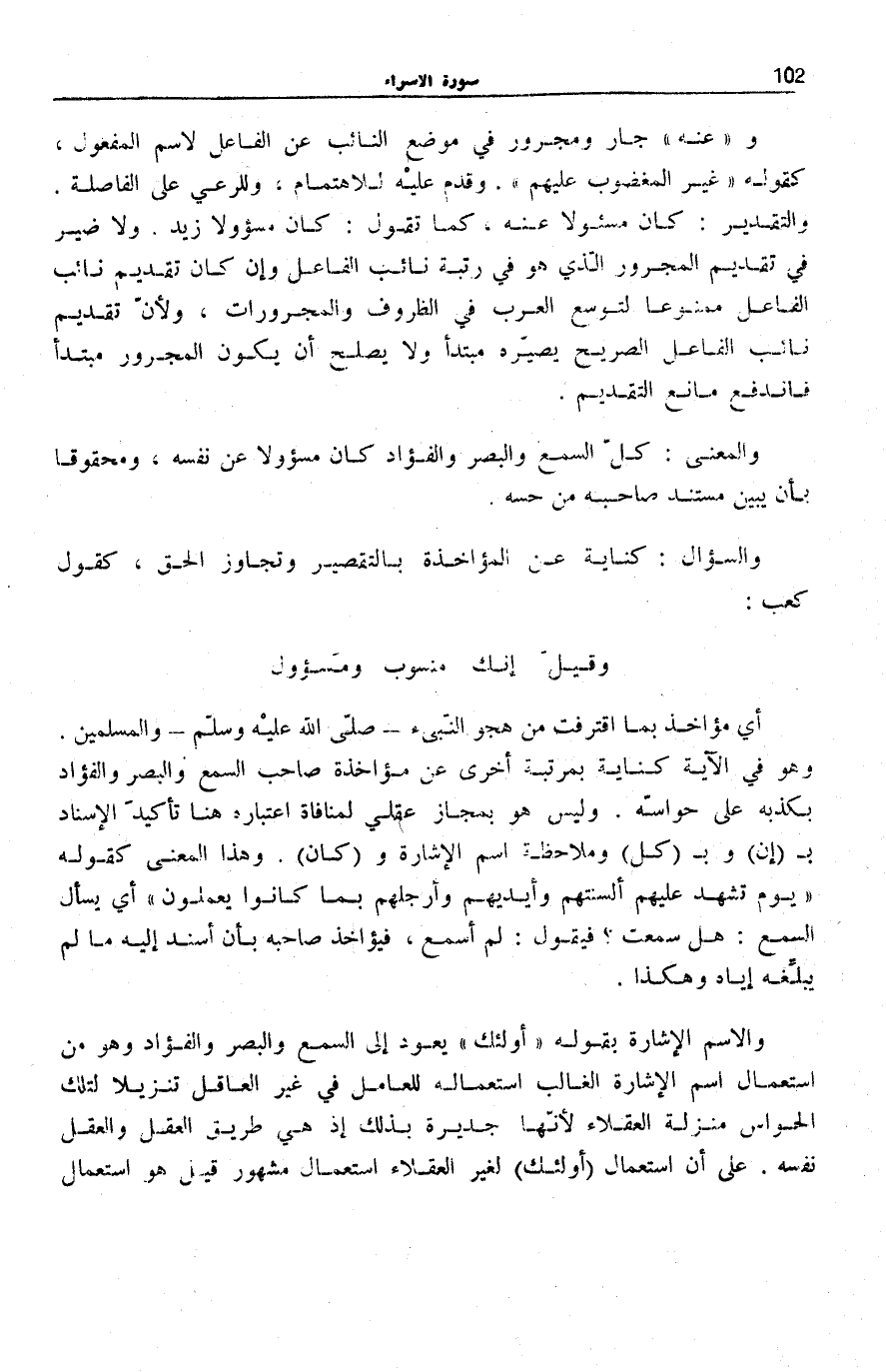 وَالِاسْمُ الْإِشَارَةُ بِقَوْلِهِ: أُولئِكَ يَعُودُ إِلَى السَّمْعِ وَالْبَصَرِ وَالْفُؤَادِ وَهُوَ مِنِ اسْتِعْمَالِ اسْمِ الْإِشَارَةِ الْغَالِبِ اسْتِعْمَالُهُ لِلْعَامِلِ فِي غَيْرِ الْعَاقِلِ تَنْزِيلًا لِتِلْكَ الْحَوَاسِّ مَنْزِلَةَ الْعُقَلَاءِ لِأَنَّهَا جَدِيرَةٌ بِذَلِكَ إِذْ هِيَ طَرِيقُ الْعَقْلِ وَالْعَقْلُ نَفْسُهُ. عَلَى أَنَّ اسْتِعْمَالَ (أُولَئِكَ) لِغَيْرِ الْعُقَلَاءِ اسْتِعْمَالٌ مَشْهُورٌ قِيلَ هُوَ اسْتِعْمَالٌ