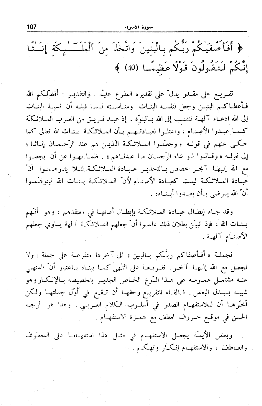 أَفَأَصْفاكُمْ رَبُّكُمْ بِالْبَنِينَ وَاتَّخَذَ مِنَ الْمَلائِكَةِ إِناثاً إِنَّكُمْ لَتَقُولُونَ قَوْلاً عَظِيماً (40)