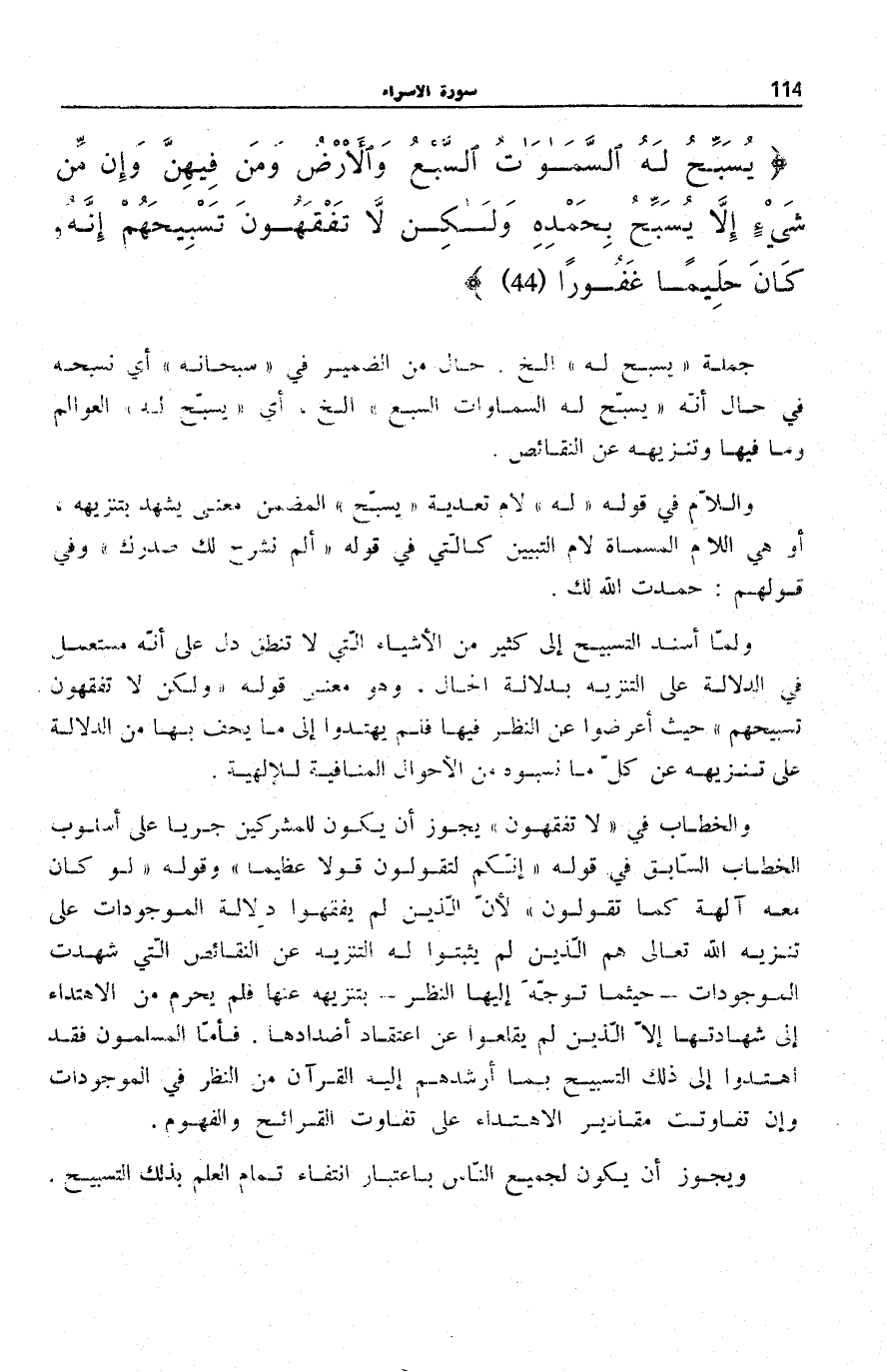 وَلَمَّا أُسْنِدَ التَّسْبِيحُ إِلَى كَثِيرٍ مِنَ الْأَشْيَاءِ الَّتِي لَا تَنْطِقُ دَلَّ عَلَى أَنَّهُ مُسْتَعْمَلٌ فِي الدَّلَالَةِ عَلَى التَّنْزِيهِ بِدَلَالَةِ الْحَالِ، وَهُوَ مَعْنَى قَوْلِهِ: وَلكِنْ لَا تَفْقَهُونَ تَسْبِيحَهُمْ حَيْثُ أَعْرَضُوا عَنِ النَّظَرِ فِيهَا فَلَمْ يَهْتَدُوا إِلَى مَا يَحِفُّ بِهَا مِنَ الدَّلَالَةِ عَلَى تَنْزِيهِهِ عَنْ كُلِّ مَا نَسَبُوهُ مِنَ الْأَحْوَالِ الْمُنَافِيَةِ لِلْإِلَهِيَّةِ.