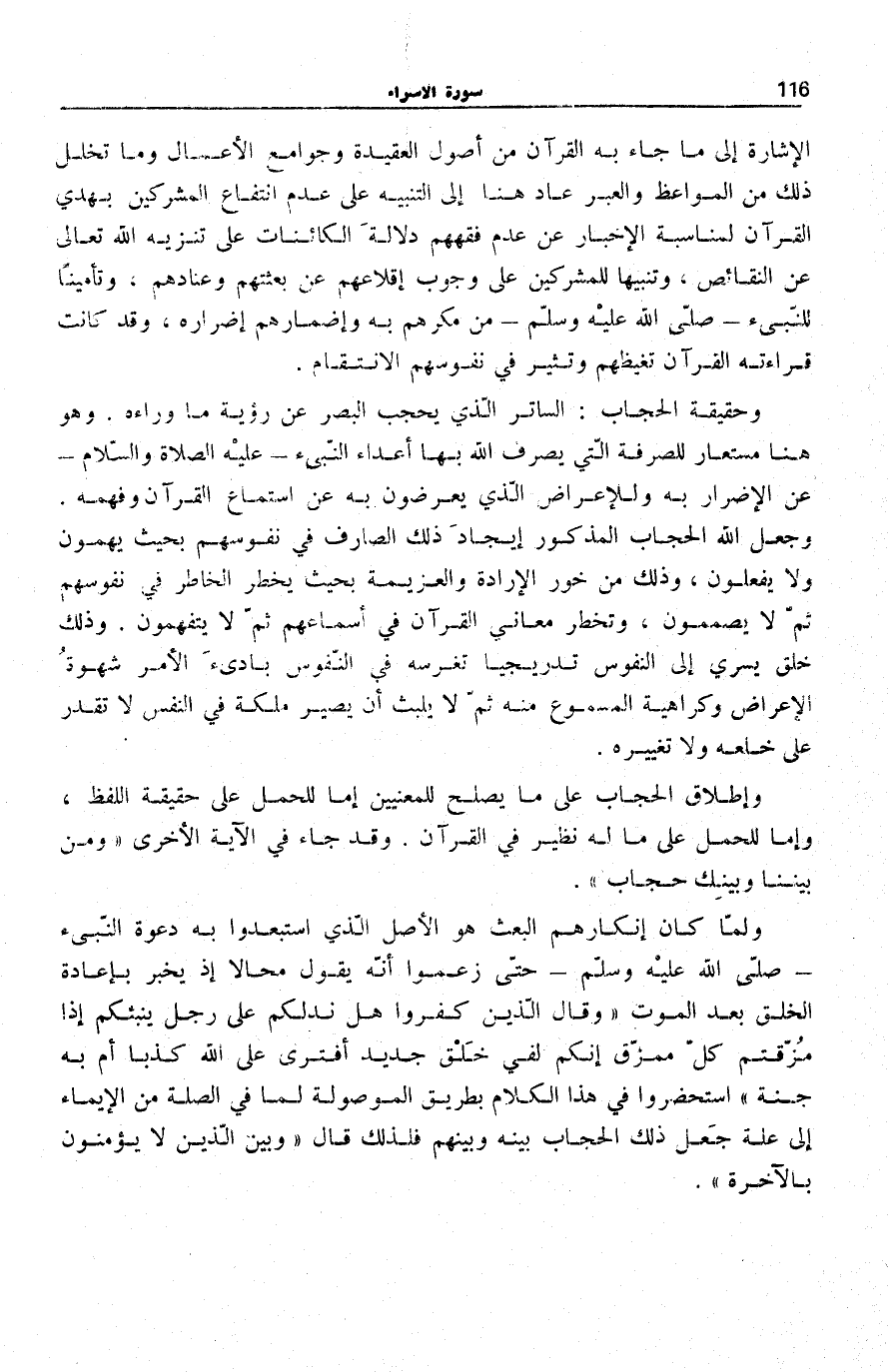وَحَقِيقَة الْحجاب: السَّاتِر الَّذِي يَحْجُبُ الْبَصَرَ عَنْ رُؤْيَةِ مَا وَرَاءَهُ. وَهُوَ هُنَا مُسْتَعَارٌ لِلصِّرْفَةِ الَّتِي يَصْرِفُ اللَّهُ بِهَا أَعدَاء النبيء- عَلَيْهِ الصَّلَاة وَالسَّلَام- عَنِ الْإِضْرَارِ بِهِ للإعراض الَّذِي يُعْرِضُونَ بِهِ عَنِ اسْتِمَاعِ الْقُرْآنِ وَفَهْمِهِ. وَجَعَلَ اللَّهُ الْحِجَابَ الْمَذْكُورَ إِيجَادَ ذَلِكَ الصَّارِفِ فِي نُفُوسِهِمْ بِحَيْثُ يَهُمُّونَ وَلَا يَفْعَلُونَ، وَذَلِكَ مِنْ خَوَرِ الْإِرَادَةِ وَالْعَزِيمَةِ بِحَيْثُ يَخْطُرُ الْخَاطِرُ فِي نُفُوسِهِمْ ثُمَّ لَا يُصَمِّمُونَ، وَتَخْطُرُ مَعَانِي الْقُرْآنِ فِي أَسْمَاعِهِمْ ثُمَّ لَا يَتَفَهَّمُونَ. وَذَلِكَ خُلُقٌ يَسْرِي إِلَى النُّفُوس تديجيا تَغْرِسُهُ فِي النُّفُوس بادىء الْأَمْرِ شَهْوَةُ الْإِعْرَاضِ وَكَرَاهِيَةُ الْمَسْمُوعِ مِنْهُ ثُمَّ لَا يَلْبَثُ أَن يصير ملكة فِي النَّفْسِ لَا تَقْدِرُ عَلَى خلعه وَلَا تَغْيِيره.