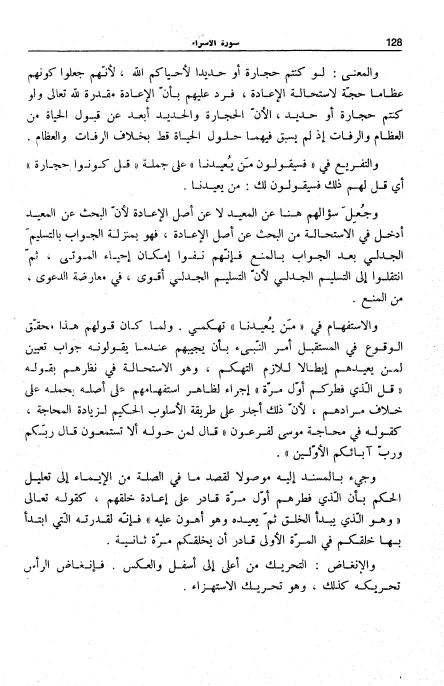وَالِاسْتِفْهَامُ فِي مَنْ يُعِيدُنا تَهَكُّمِيٌّ. وَلَمَّا كَانَ قَوْلُهُمْ هَذَا مُحَقَّقُ الْوُقُوعِ فِي الْمُسْتَقْبَلِ أَمَرَ النبيء بِأَن يُجِيبهُمْ عِنْد مَا يَقُولُونَهُ جَوَابَ تَعْيِينٍ لِمَنْ يُعِيدُهُمْ إِبْطَالًا لِلَازِمِ التَّهَكُّمِ، وَهُوَ الِاسْتِحَالَةُ فِي نَظَرِهِمْ بِقَوْلِهِ: قُلِ الَّذِي فَطَرَكُمْ أَوَّلَ مَرَّةٍ إِجْرَاءٌ لِظَاهِرِ اسْتِفْهَامِهِمْ عَلَى أَصْلِهِ بِحَمْلِهِ عَلَى خِلَافِ مُرَادِهِمْ، لِأَنَّ ذَلِكَ أَجْدَرُ عَلَى طَرِيقَةِ الْأُسْلُوبِ الْحَكِيمِ لِزِيَادَةِ الْمُحَاجَّةِ، كَقَوْلِهِ فِي مُحَاجَّةِ مُوسَى لِفِرْعَوْنَ قالَ لِمَنْ حَوْلَهُ أَلا تَسْتَمِعُونَ قالَ رَبُّكُمْ وَرَبُّ آبائِكُمُ الْأَوَّلِينَ [الشُّعَرَاء: 25- 26] .