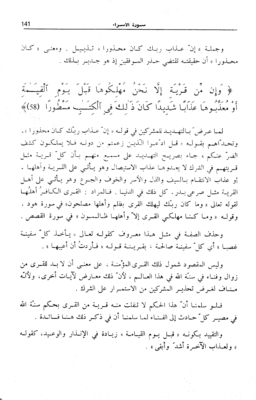 وَإِنْ مِنْ قَرْيَةٍ إِلاَّ نَحْنُ مُهْلِكُوها قَبْلَ يَوْمِ الْقِيامَةِ أَوْ مُعَذِّبُوها عَذاباً شَدِيداً كانَ ذلِكَ فِي الْكِتابِ مَسْطُوراً (58)
