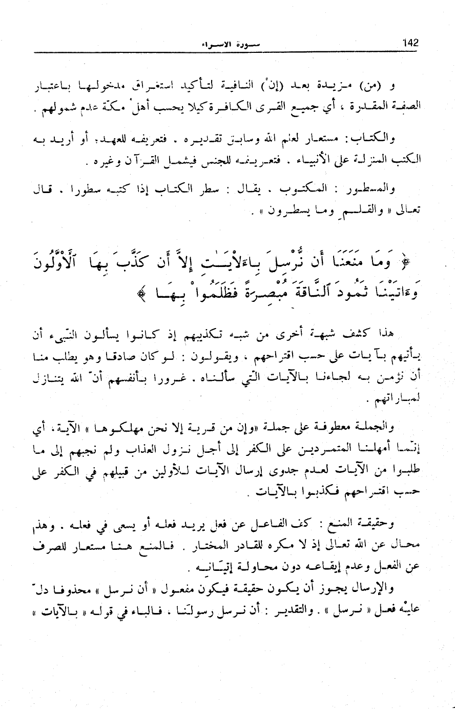 وَما مَنَعَنا أَنْ نُرْسِلَ بِالْآياتِ إِلَّا أَنْ كَذَّبَ بِهَا الْأَوَّلُونَ وَآتَيْنا ثَمُودَ النَّاقَةَ مُبْصِرَةً فَظَلَمُوا بِها هَذَا كَشْفُ شُبْهَةٍ أُخْرَى مِنْ شُبَهِ تَكْذِيبِهِمْ إِذْ كَانُوا يسْأَلُون النَّبِي أَنْ يَأْتِيَهُمْ بِآيَاتٍ عَلَى حَسَبِ اقْتِرَاحِهِمْ، وَيَقُولُونَ: لَوْ كَانَ صَادِقًا وَهُوَ يَطْلُبُ مِنَّا أَنْ نُؤْمِنَ بِهِ لَجَاءَنَا بِالْآيَاتِ الَّتِي سَأَلْنَاهُ، غُرُورًا بِأَنْفُسِهِمْ أَنَّ اللَّهَ يَتَنَازَلُ لِمُبَارَاتِهِمْ.