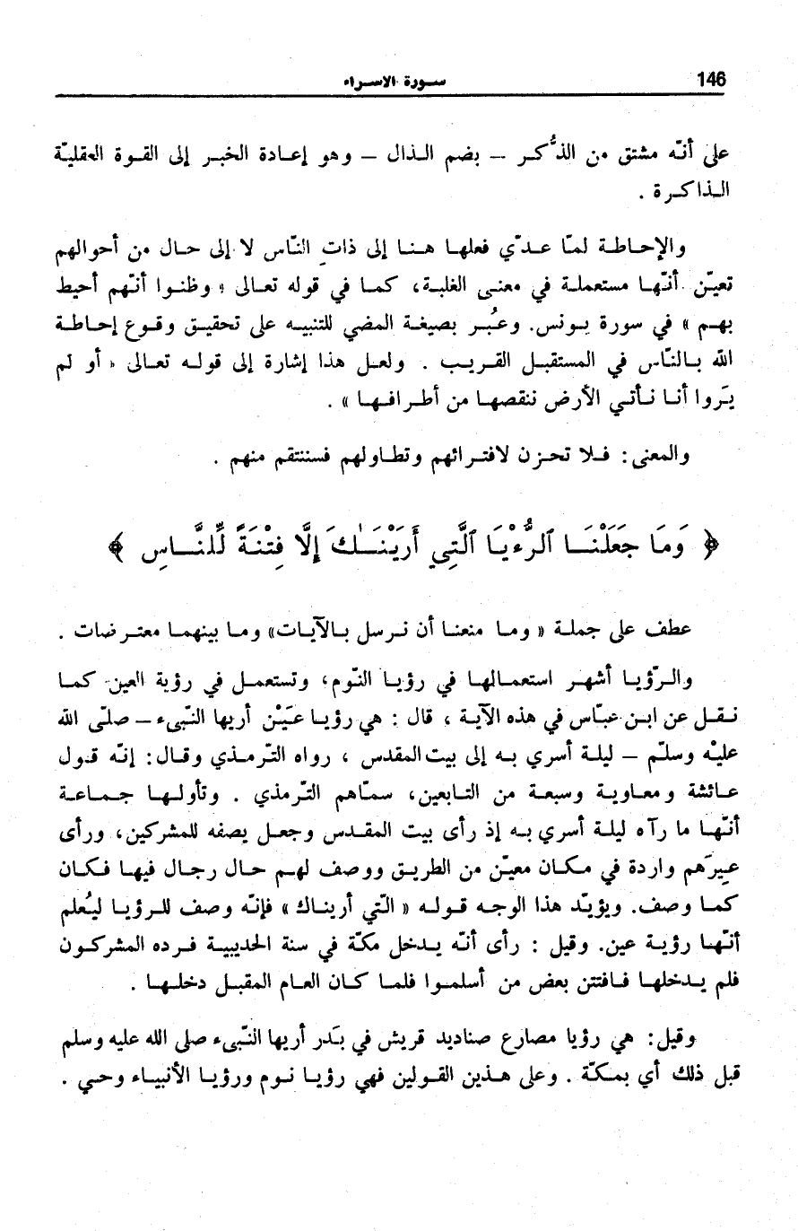 ابْنِ عَبَّاسٍ فِي هَذِهِ الْآيَةِ، قَالَ: هِيَ رُؤْيَا عَيْنٍ أريها النبيء صَلَّى اللهُ عَلَيْهِ وَسَلَّمَ لَيْلَةَ أُسْرِيَ بِهِ إِلَى بَيْتِ الْمَقْدِسِ، رَوَاهُ التِّرْمِذِيُّ وَقَالَ: إِنَّهُ قَوْلُ عَائِشَةَ وَمُعَاوِيَةَ وَسَبْعَةٍ مِنَ التَّابِعِينَ، سَمَّاهُمُ التِّرْمِذِيُّ. وَتَأَوَّلَهَا جَمَاعَةٌ أَنَّهَا مَا رَآهُ لَيْلَةَ أُسْرِيَ بِهِ إِذْ رَأَى بَيْتَ الْمَقْدِسِ وَجَعَلَ يَصِفُهُ لِلْمُشْرِكِينَ، وَرَأَى عِيرَهُمْ وَارِدَةً فِي مَكَانٍ مُعَيَّنٍ مِنَ الطَّرِيقِ وَوَصَفَ لَهُمْ حَالَ رِجَالٍ فِيهَا فَكَانَ كَمَا وَصَفَ. وَيُؤَيِّدُ هَذَا الْوَجْهَ قَوْلُهُ: الَّتِي أَرَيْناكَ فَإِنَّهُ وَصْفٌ لِلرُّؤْيَا لِيُعْلَمَ أَنَّهَا رُؤْيَةُ عَيْنٍ. وَقِيلَ: رَأَى أَنَّهُ يَدْخُلُ مَكَّةَ فِي سَنَةِ الْحُدَيْبِيَةِ فَرَدَّهُ الْمُشْرِكُونَ فَلَمْ يَدْخُلْهَا فَافْتَتَنَ بَعْضُ مَنْ أَسْلَمُوا فَلَمَّا كَانَ الْعَامُ الْمُقْبِلُ دَخَلَهَا.