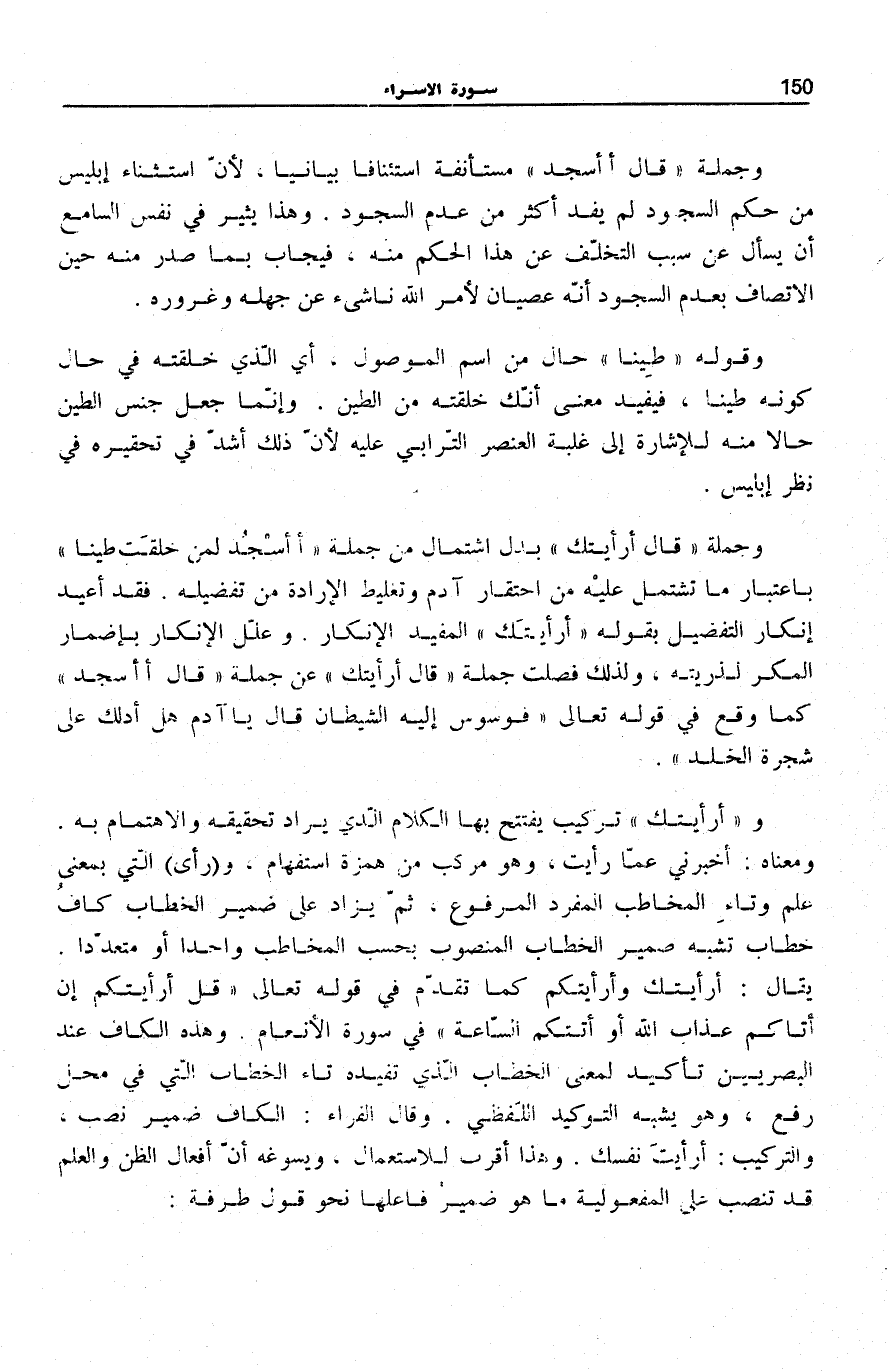 أَرَأَيْتَكَ الْمُفِيدِ الْإِنْكَارَ. وَعَلَّلَ الْإِنْكَارَ بِإِضْمَارِ الْمَكْرِ لِذُرِّيَّتِهِ، وَلِذَلِكَ فُصِلَتْ جُمْلَةُ قالَ أَرَأَيْتَكَ عَنْ جُمْلَةِ قالَ أَأَسْجُدُ كَمَا وَقَعَ فِي قَوْلِهِ تَعَالَى: فَوَسْوَسَ إِلَيْهِ الشَّيْطانُ قالَ يَا آدَمُ هَلْ أَدُلُّكَ عَلى شَجَرَةِ الْخُلْدِ [طه: 120] .